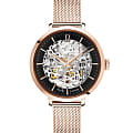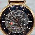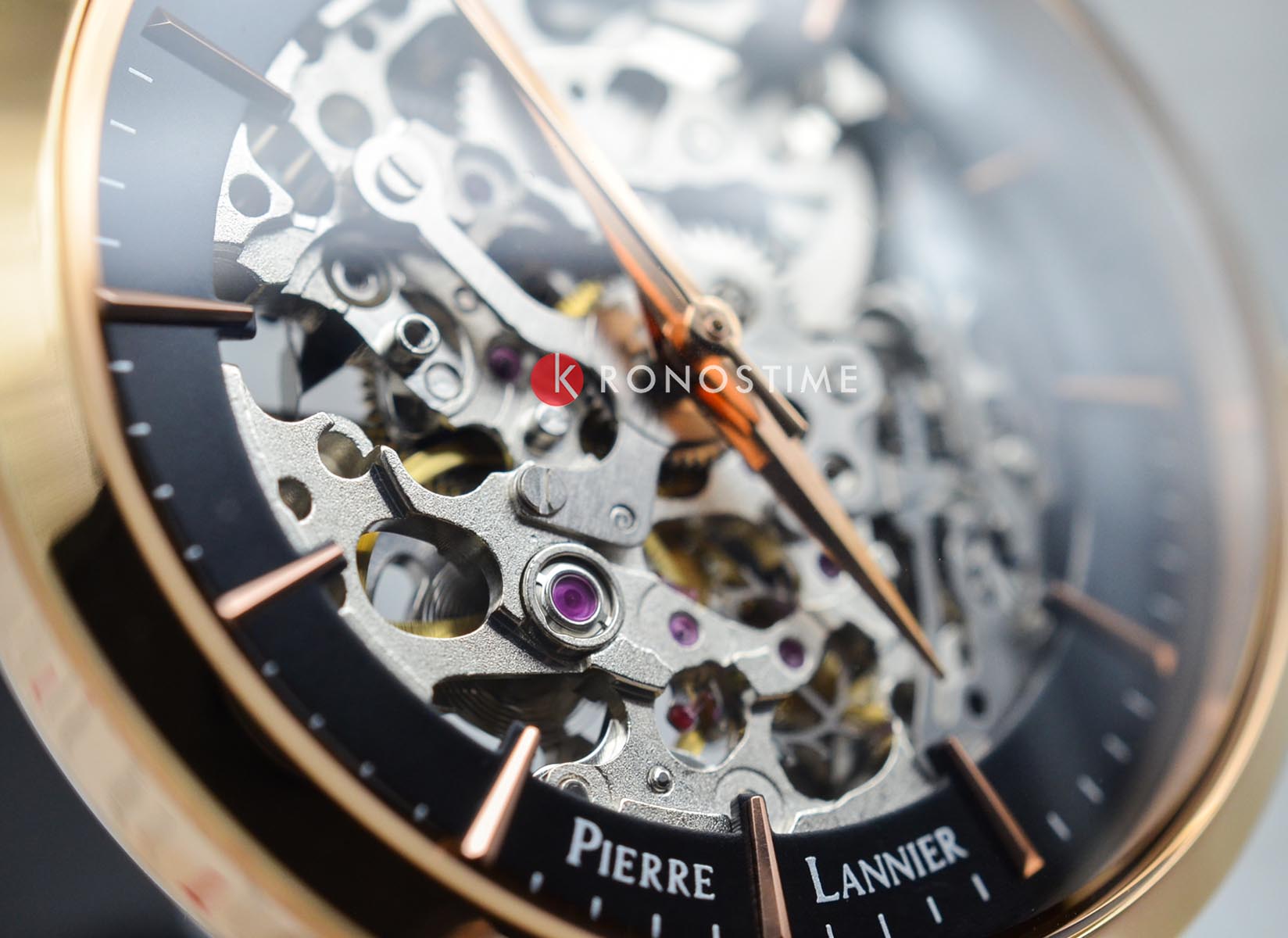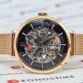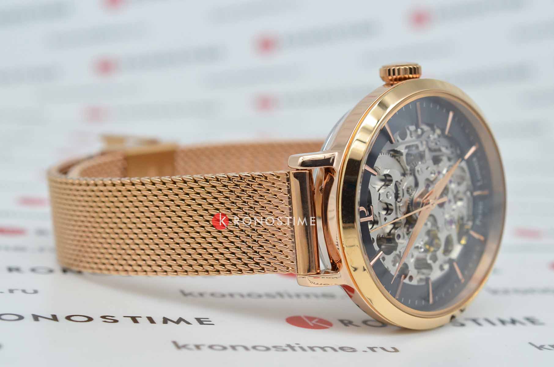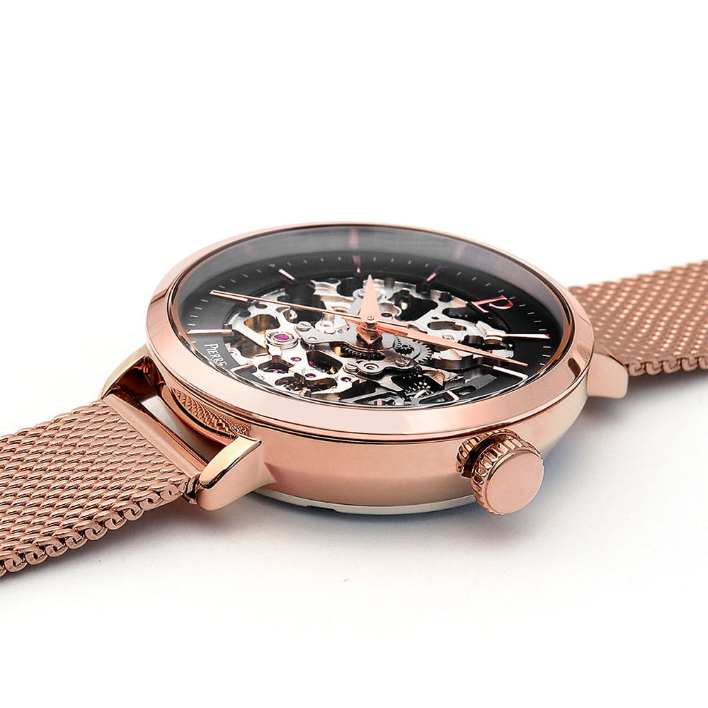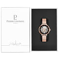 Женские механические часы с автоподзаводом Pierre Lannier Automatic 313B938. Минеральное стеклоМинеральное стеклоМинеральное стекло представляет собой искусственно выращенный минерал кварца. Такое стекло отличается особой устойчивостью к повреждениям и царапинам. Уступает по некоторым качествам сапфировому стеклу. устойчивое к мелким механическим повреждениям. Скелетонизированный циферблат с золотистыми стрелками и часовыми метками. Центральные часовая, минутная и секундная стрелки. Круглый корпус выполнен из полированной нержавеющей стали с PVD-покрытиемPVDУльтратонкое покрытие наносится в технике вакуумного напыления, сочетает в себе нитрид титана особой прочности со слоем золота или оксида хрома. Несёт в себе декоративную или защитную функцию. цвета розового золота. Диаметр корпуса составляет 35 мм, толщина 12 мм. Стальной браслет с покрытием выполнен шириной 14 мм в технике миланского плетения, раскладная застёжкаРаскладная застёжкаТакой тип застёжки используется только на браслетах из металла. Она никогда не раскрывается полностью, происходит разделение на 2 и более частей. Раскладывающая застёжка снизит вероятность потери часов к минимуму.. Неподвижный безельБезельВнешний ободок, закрепляющий стекло. В спортивных часах так называется поворотное кольцо с делениями на циферблате, выполняет роль таймера – замеряет отрезки времени на шкале. Неподвижный безель – элемент декора. Однонаправленно вращающийся безель на дайверских часах позволяет фиксировать моменты погружения и выныривания на поверхность. из нержавеющей стали с PVD-покрытиемPVDУльтратонкое покрытие наносится в технике вакуумного напыления, сочетает в себе нитрид титана особой прочности со слоем золота или оксида хрома. Несёт в себе декоративную или защитную функцию. цвета розового золота. Водостойкость: 30 метров, позволит защитить корпус от случайных брызг или капель дождя.