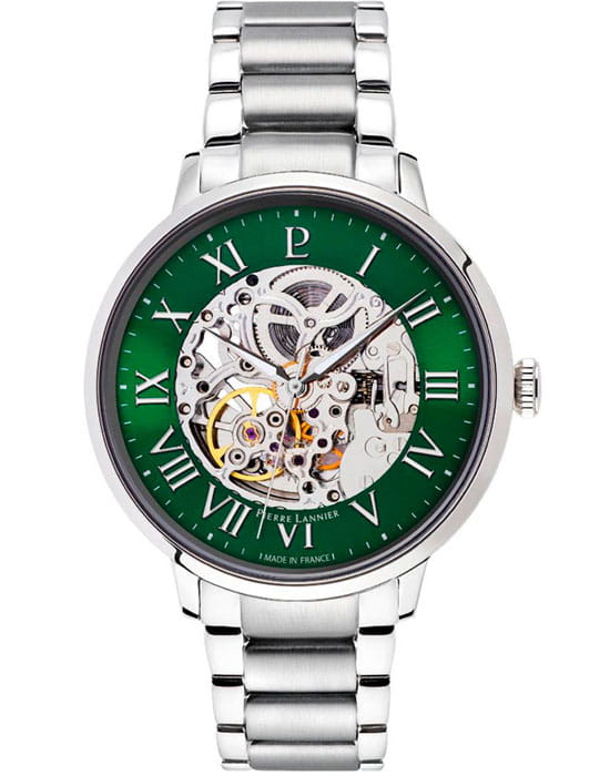 Мужские механические часы с автоподзаводом Pierre Lannier Automatic 317B171. Минеральное стеклоМинеральное стеклоМинеральное стекло представляет собой искусственно выращенный минерал кварца. Такое стекло отличается особой устойчивостью к повреждениям и царапинам. Уступает по некоторым качествам сапфировому стеклу. устойчивое к мелким механическим повреждениям. Центральные часовая, минутная и секундная стрелки. Корпус и браслет выполнены из нержавеющей стали. Водостойкость: 50 метров, позволит защитить корпус от случайных брызг или капель дождя. Стрелки с люминесцентным покрытиемЛюминесцентное покрытиеПозволяет считывать показания времени в темноте. Производители наносят на стрелки, часовые индексы, безель или поверхность циферблата светонакопительный состав, дающий холодное свечение.. Зеленый скелетонизированный циферблат. Удобный стальной браслет на раскладной застёжкеРаскладная застёжкаТакой тип застёжки используется только на браслетах из металла. Она никогда не раскрывается полностью, происходит разделение на 2 и более частей. Раскладывающая застёжка снизит вероятность потери часов к минимуму.. Прозрачная задняя крышка.