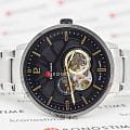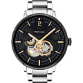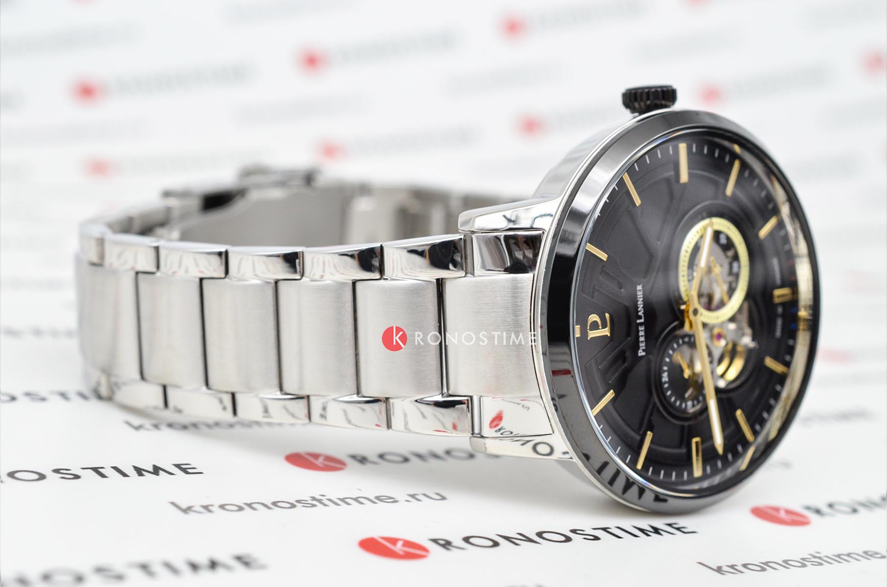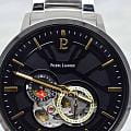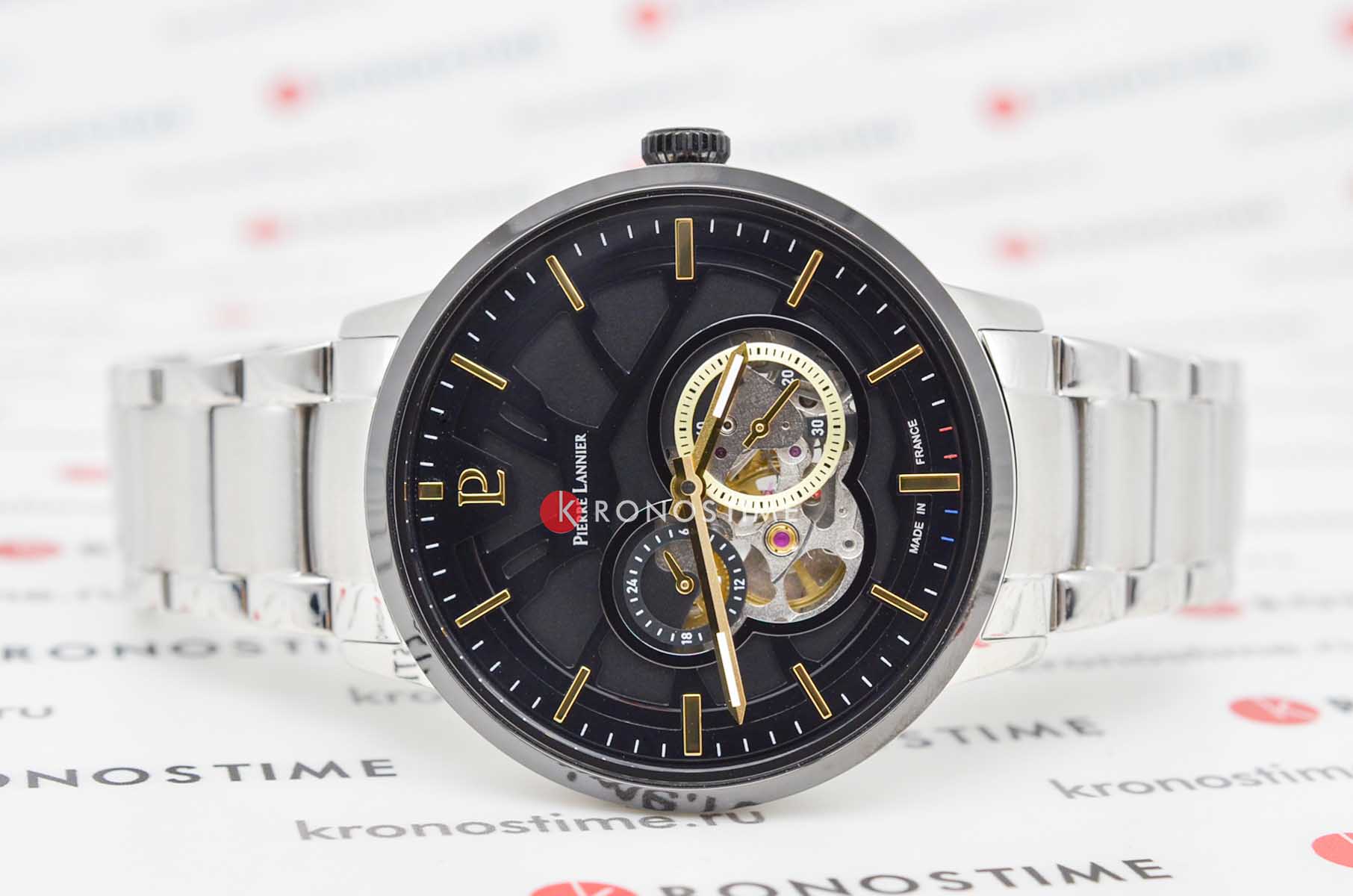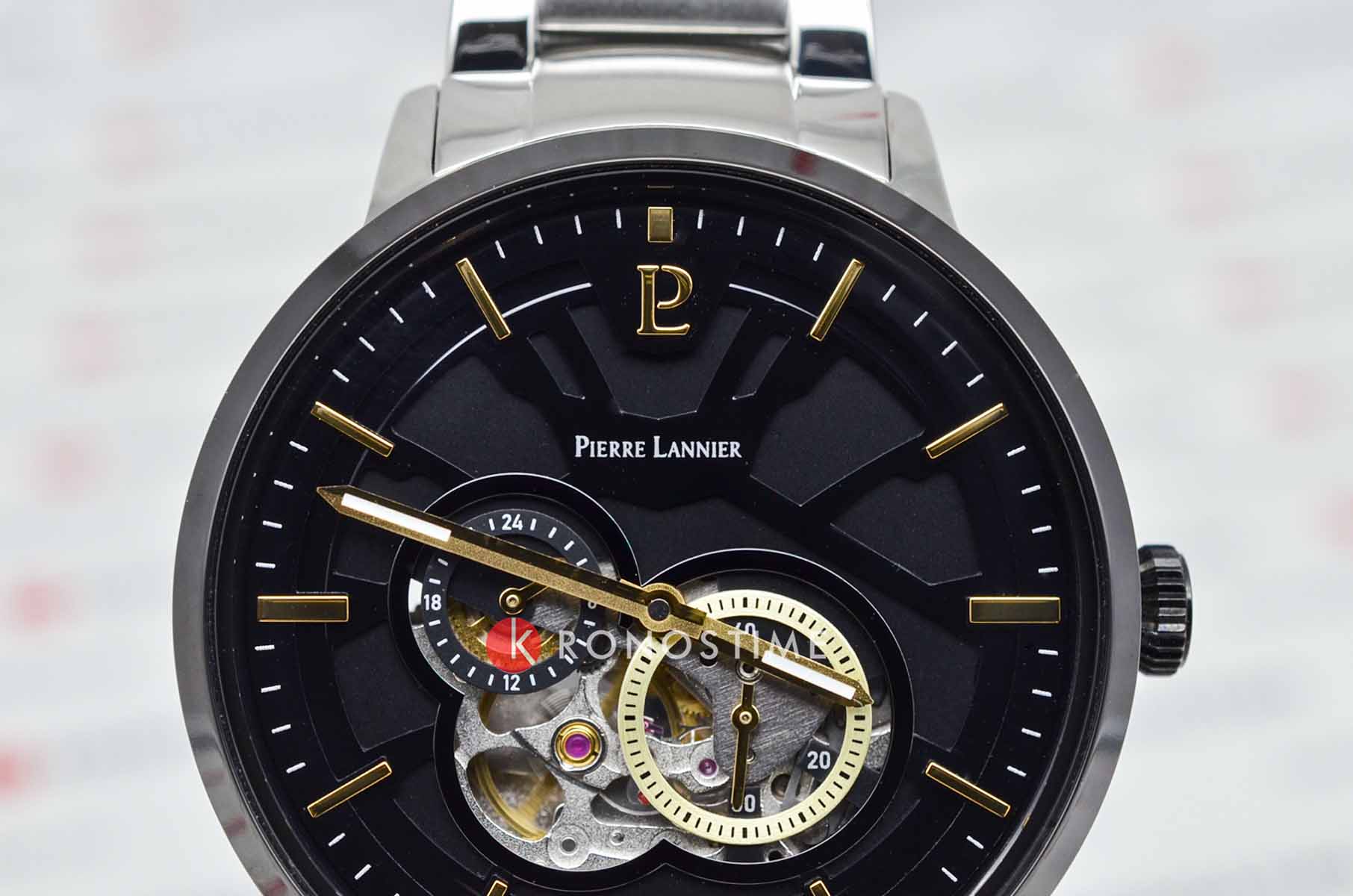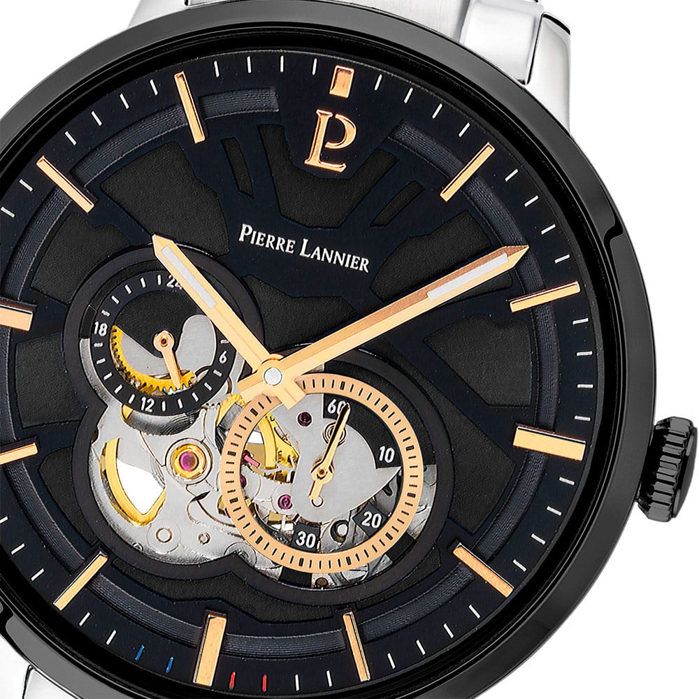Мужские механические часы с автоподзаводом Pierre Lannier Trio 331H131. Минеральное стеклоМинеральное стеклоМинеральное стекло представляет собой искусственно выращенный минерал кварца. Такое стекло отличается особой устойчивостью к повреждениям и царапинам. Уступает по некоторым качествам сапфировому стеклу. устойчивое к мелким механическим повреждениям. Центральные часовая и минутная стрелки, секундная стрелка вынесена в малый циферблат. 12/24х часовой формат времени. Черный скелетонизированный циферблат. Корпус выполнен из нержавеющей стали с IP-покрытиемIP-покрытиеМетод ионного напыления. Демонстрирует повышенную устойчивость к истиранию, окислению и химическим веществам. Под воздействием высокого давления и температуры около 1500°C молекулы металла надёжно соединяются с частицами корпуса часов.. Водостойкость: 50 метров, позволит защитить корпус от случайных брызг или капель дождя. Стальной браслет на раскладной застёжкеРаскладная застёжкаТакой тип застёжки используется только на браслетах из металла. Она никогда не раскрывается полностью, происходит разделение на 2 и более частей. Раскладывающая застёжка снизит вероятность потери часов к минимуму.. Стрелки с люминесцентным покрытиемЛюминесцентное покрытиеПозволяет считывать показания времени в темноте. Производители наносят на стрелки, часовые индексы, безель или поверхность циферблата светонакопительный состав, дающий холодное свечение.. Диаметр корпуса составляет 42 мм, толщина 13,55 мм.