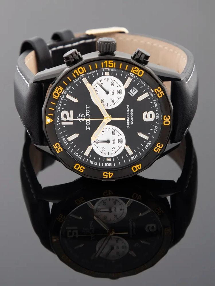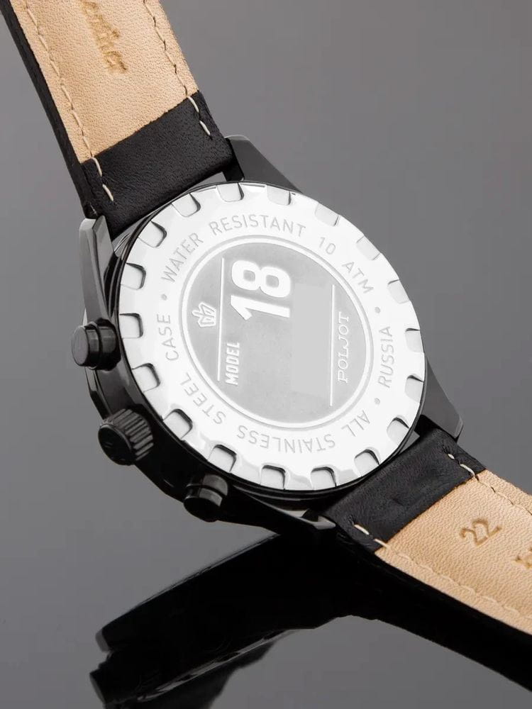 Poljot 6S21.184256 — яркие мужские часы с выразительным спортивным характером и акцентом на функциональность. Корпус из нержавеющей стали с PVD-покрытиемPVDУльтратонкое покрытие наносится в технике вакуумного напыления, сочетает в себе нитрид титана особой прочности со слоем золота или оксида хрома. Несёт в себе декоративную или защитную функцию. придаёт модели надёжность и солидность, а насыщенный циферблат с контрастными счётчиками хронографаХронографФункция позволяет измерять отрезки времени с особой точностью: часы, минуты, секунды. Верным признаком хронографа является наличие на циферблате 3 дополнительных окошек-счётчиков. создаёт динамичный и энергичный облик. БезельБезельВнешний ободок, закрепляющий стекло. В спортивных часах так называется поворотное кольцо с делениями на циферблате, выполняет роль таймера – замеряет отрезки времени на шкале. Неподвижный безель – элемент декора. Однонаправленно вращающийся безель на дайверских часах позволяет фиксировать моменты погружения и выныривания на поверхность. с PVD-покрытиемPVDУльтратонкое покрытие наносится в технике вакуумного напыления, сочетает в себе нитрид титана особой прочности со слоем золота или оксида хрома. Несёт в себе декоративную или защитную функцию.. Широкие стрелки и метки с люминесцентным покрытиемЛюминесцентное покрытиеПозволяет считывать показания времени в темноте. Производители наносят на стрелки, часовые индексы, безель или поверхность циферблата светонакопительный состав, дающий холодное свечение. обеспечивают отличную читаемость в любых условиях, а внешний обод с минутной шкалой подчёркивает спортивный стиль. Окно даты добавляет практичности. Прочное минеральное стеклоМинеральное стеклоМинеральное стекло представляет собой искусственно выращенный минерал кварца. Такое стекло отличается особой устойчивостью к повреждениям и царапинам. Уступает по некоторым качествам сапфировому стеклу. надёжно защищает циферблат от повреждений, а ремешок из натуральной кожи гармонично дополняет контрастную цветовую палитру. Poljot — это смелое сочетание спортивной энергии, точности и современного дизайна для активного и уверенного мужчины.