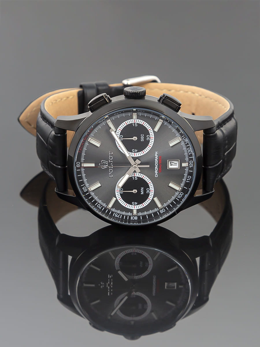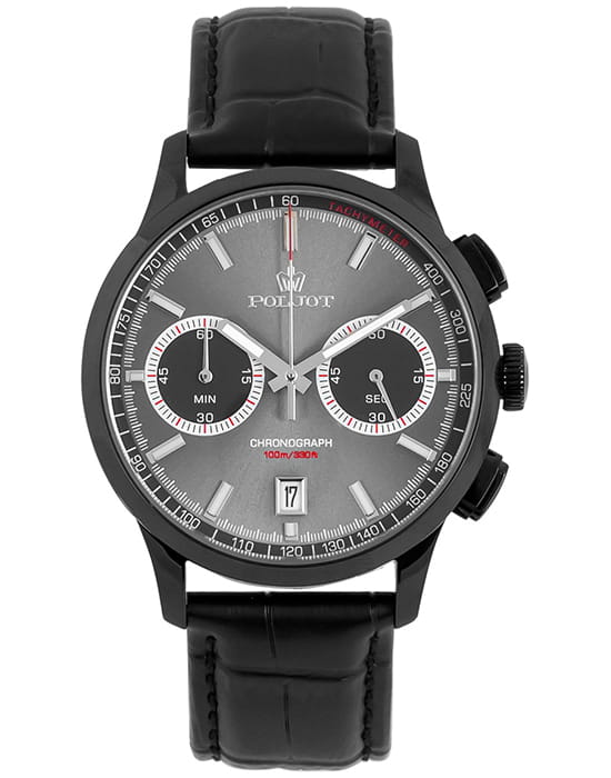 Poljot 6S21.904212 — современные мужские часы с выразительным спортивным дизайном и надёжной функциональностью. Корпус из нержавеющей стали с с PVD-покрытиемPVDУльтратонкое покрытие наносится в технике вакуумного напыления, сочетает в себе нитрид титана особой прочности со слоем золота или оксида хрома. Несёт в себе декоративную или защитную функцию. подчёркивает прочность и уверенный характер модели, а глубокий циферблат с счётчиками хронографаХронографФункция позволяет измерять отрезки времени с особой точностью: часы, минуты, секунды. Верным признаком хронографа является наличие на циферблате 3 дополнительных окошек-счётчиков. и аккуратным окном даты на позиции «6 часов» придаёт часам динамичный вид. Контрастные стрелки и метки с люминесцентным покрытиемЛюминесцентное покрытиеПозволяет считывать показания времени в темноте. Производители наносят на стрелки, часовые индексы, безель или поверхность циферблата светонакопительный состав, дающий холодное свечение. обеспечивают удобство считывания информации в любое время суток, а внешняя шкала тахиметраТахиметрРазмеченная шкала, располагается на ободке или безеле часов. Тахиметр позволяет рассчитать скорость на определённом участке пути, расстояние измеряется в километрах или милях. добавляет спортивную функциональность. Прочное минеральное стеклоМинеральное стеклоМинеральное стекло представляет собой искусственно выращенный минерал кварца. Такое стекло отличается особой устойчивостью к повреждениям и царапинам. Уступает по некоторым качествам сапфировому стеклу. защищает циферблат от царапин, а ремешок из натуральной кожи гарантирует комфорт и элегантную посадку на запястье. Poljot — это гармония классики и спортивного духа, созданная для мужчин, ценящих точность, надёжность и уверенный стиль.