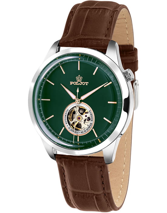 Poljot 82S0.581023 — изысканные механические мужские часы с автоподзаводом, в которых классика сочетается с технической эстетикой. Корпус из нержавеющей стали подчёркивает надёжность и строгость формы, а глубокий циферблат с изящным окном «open heart» демонстрирует работу механизма, придавая модели характер инженерной утончённости. Стрелки и метки с люминесцентным покрытиемЛюминесцентное покрытиеПозволяет считывать показания времени в темноте. Производители наносят на стрелки, часовые индексы, безель или поверхность циферблата светонакопительный состав, дающий холодное свечение.. Металлизированные стрелки и метки создают аккуратный контраст и обеспечивают превосходную читаемость, а прочное минеральное стеклоМинеральное стеклоМинеральное стекло представляет собой искусственно выращенный минерал кварца. Такое стекло отличается особой устойчивостью к повреждениям и царапинам. Уступает по некоторым качествам сапфировому стеклу. надёжно защищает циферблат от повреждений. Ремешок из натуральной кожи тёплого коричневого оттенка добавляет образу благородства и комфорта. Poljot — это часы для мужчин, ценящих механику, традиции и спокойную уверенность в каждой детали.