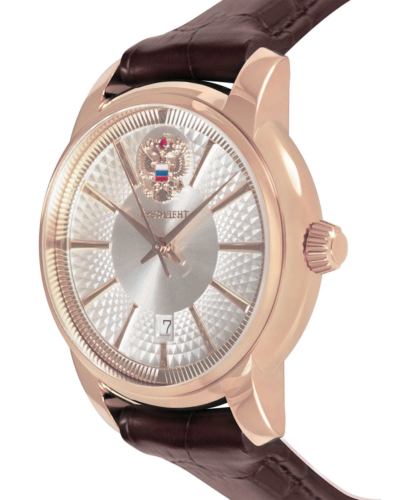 Мужские часы из коллекции «Президент» — это стильный аксессуар, выполненный в розовом золоте и сочетающий в себе элегантность и точность. Модель оснащена сапфировым стекломСапфировое стеклоПрочный и надёжный материал из кристалла сапфира синтетического происхождения, характеризующийся особой твёрдостью и устойчивостью к царапинам и повреждениям., устойчивым к царапинам и механическим повреждениям. Циферблат украшен контуром русской матрешки и инкрустирован кристаллами Swarovski, что придаёт модели особую привлекательность и изысканность. Часы имеют механизм с автоподзаводом, обеспечивающим надёжную работу без необходимости частой подзаводки. Задняя крышка с чеканкой Герба России подчёркивает национальную принадлежность и уникальность модели. Кожаный ремешок дополнен классической застёжкой, обеспечивая комфорт и элегантный образ. Водонепроницаемость позволяет использовать модель в повседневных условиях — при мытье рук или под лёгким дождём. Эти часы станут универсальным аксессуаром для тех, кто ценит сочетание стиля, качества и символики — идеальный выбор для уверенных в себе мужчин, следящих за своим имиджем и предпочитающих выделяться.