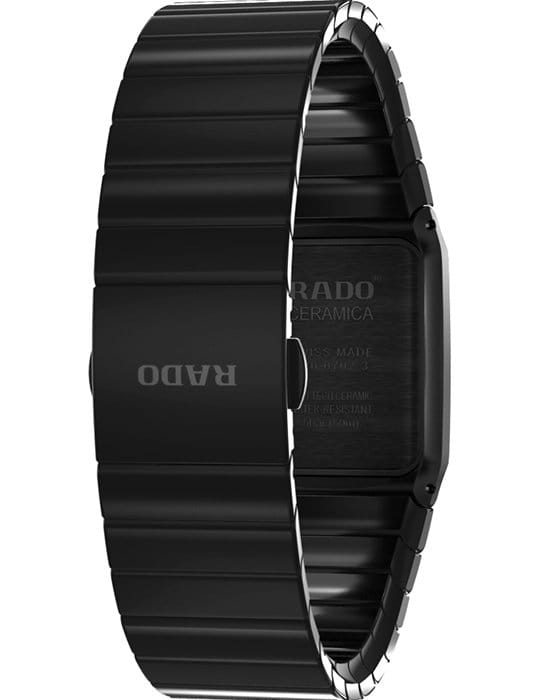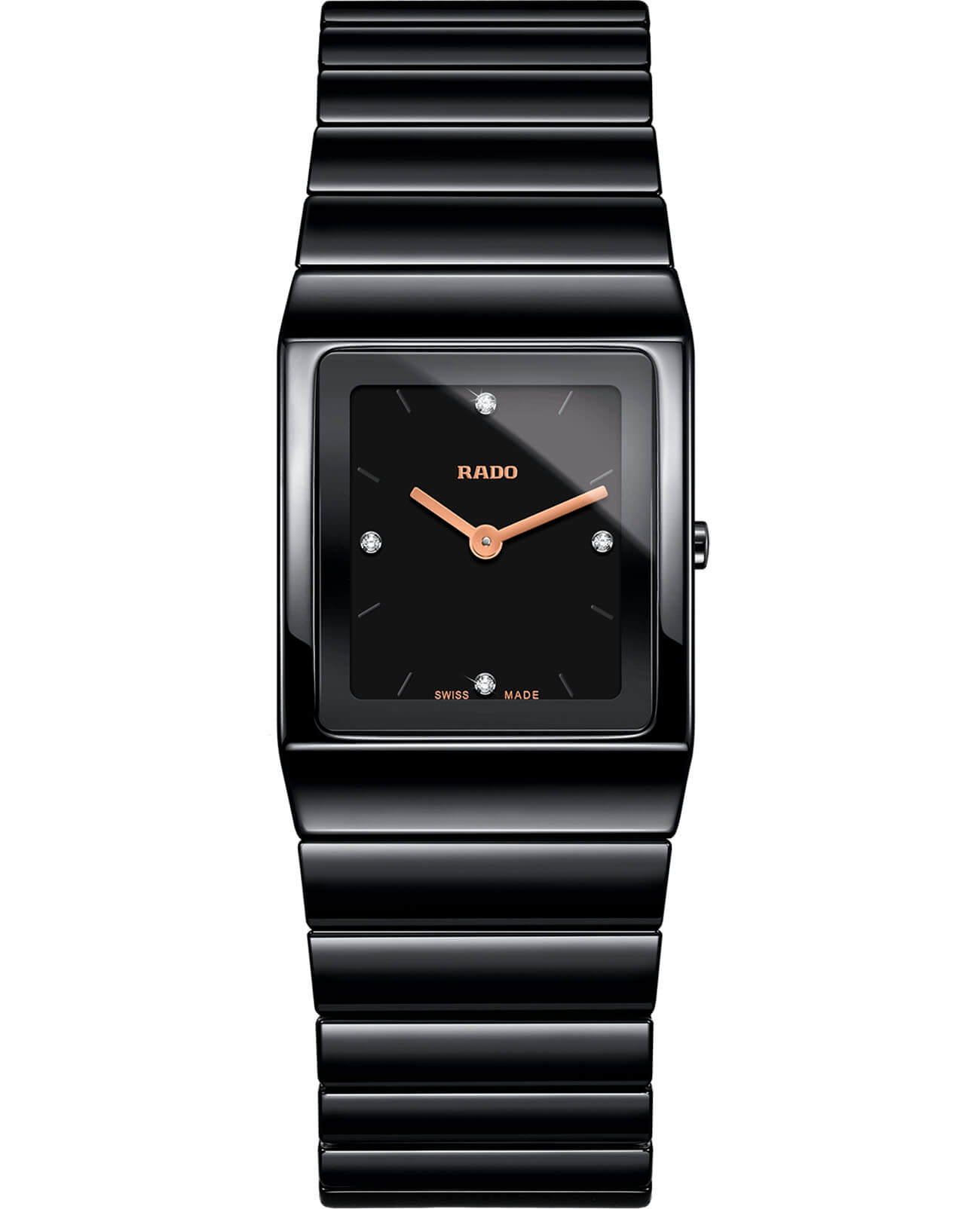 Чёрный прямоугольный циферблат с золотистыми стрелками находится в обрамлении надёжного керамического корпуса. В качестве украшения используются 4 бриллианта в 0,011 карат, драгоценные камни добавляют красоты и изящества. Чёткие геометрические формы. Кварцевый швейцарский механизм ETA 282.001 с высокой точностью хода. Использование высокотехнологичной керамикиВысокотехнологичная керамикаИнновационный запатентованный Rado материал с гладкой или матовой поверхностью. Керамика за счёт кристаллической структуры обладает повышенной устойчивостью от возникновения царапин. Материал способен принимать температуру тела человека, обеспечивая невероятный комфорт при ношении.. Стекло из сапфира. Водонепроницаемость при давлении 5 бар. Габариты: 31,7 x 22,9 x 6,6 мм.
