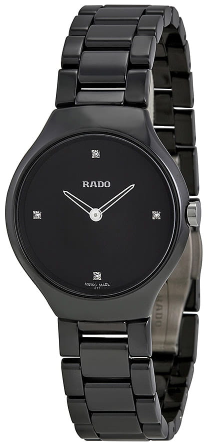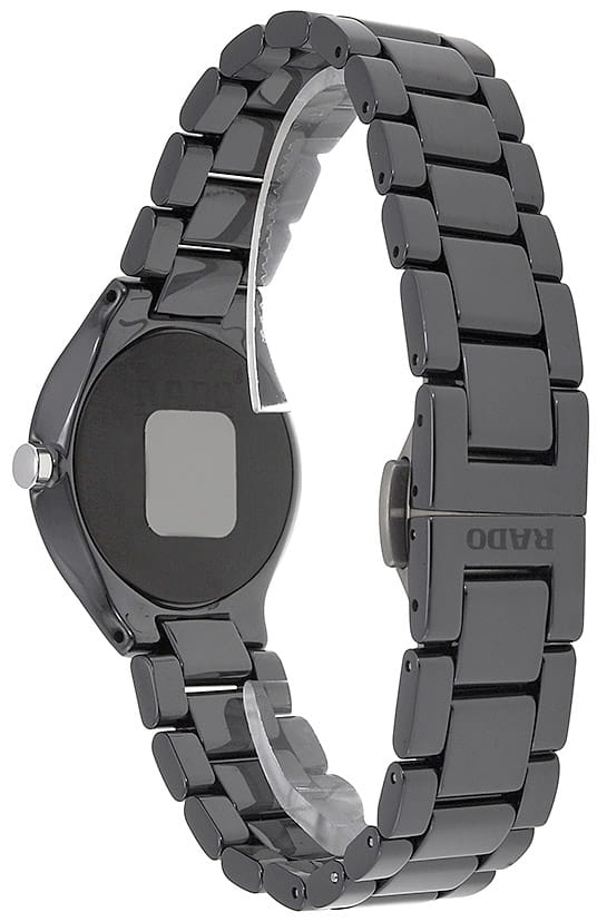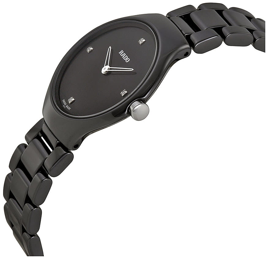 Швейцарские женские Rado True Thinline Diamonds R27742712, кварцевый механизм с высокой точностью. Сапфировое стеклоСапфировое стеклоПрочный и надёжный материал из кристалла сапфира синтетического происхождения, характеризующийся особой твёрдостью и устойчивостью к царапинам и повреждениям. устойчивое к появлению царапин, обладающее высокой прозрачностью. Корпус часов изготовлен из высокотехнологичной керамикиВысокотехнологичная керамикаИнновационный запатентованный Rado материал с гладкой или матовой поверхностью. Керамика за счёт кристаллической структуры обладает повышенной устойчивостью от возникновения царапин. Материал способен принимать температуру тела человека, обеспечивая невероятный комфорт при ношении.. Циферблат украшен бриллиантами. Класс водозащиты: 30 метров, позволит защитить корпус от случайных брызг или капель дождя. Керамический браслет на застёжке-бабочке с кнопкамиЗастёжка "бабочка"Такой вид застёжки дополняется предохранителями, помогающими избежать случайного раскрытия браслета. Обладают изящным исполнением. .