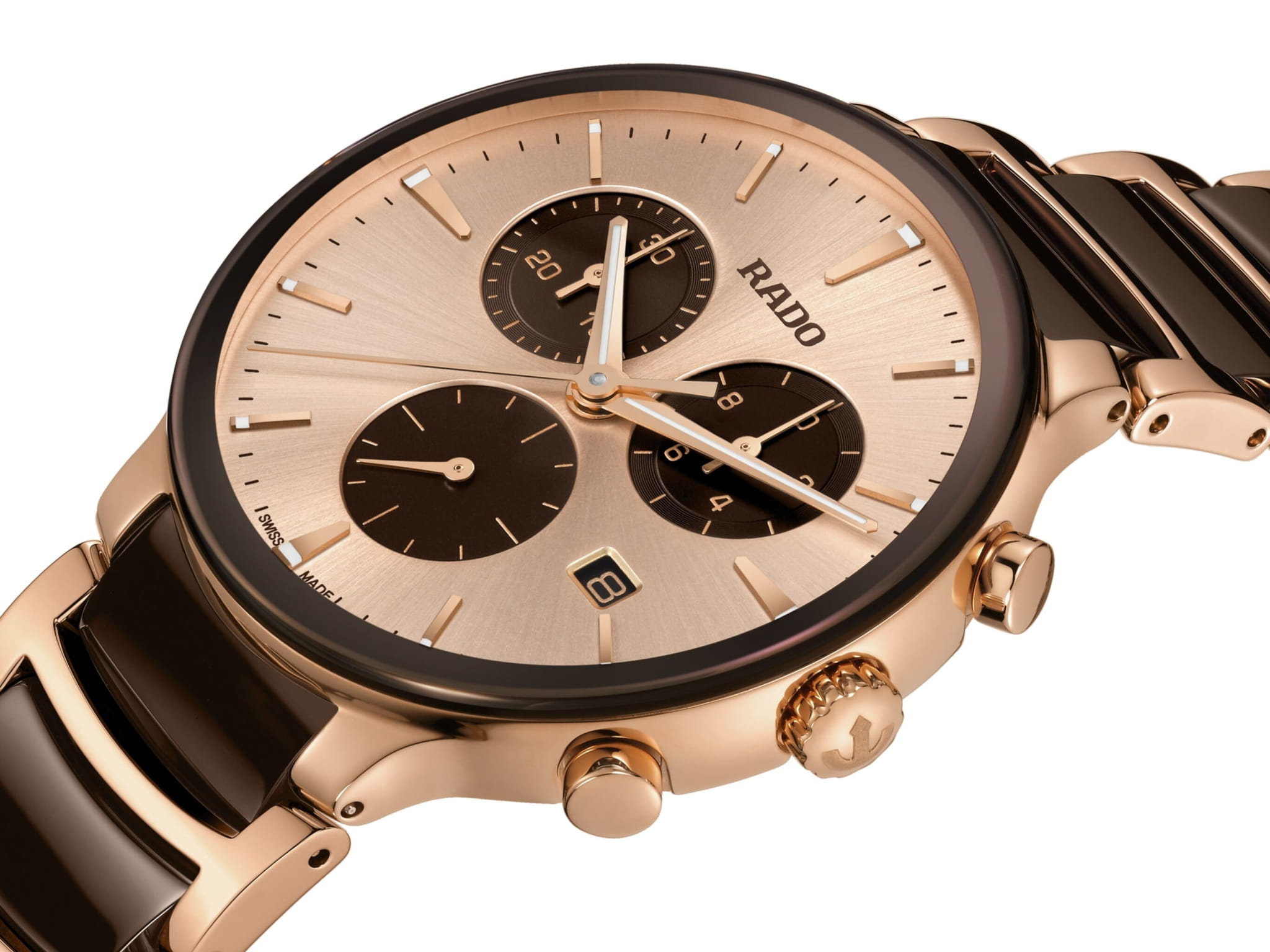 Мужские кварцевые часы Rado Centrix Chronograph — это гармоничное сочетание художественного дизайна и технического совершенства. Корпус диаметром 41 мм и толщиной 11,4 мм выполнен из нержавеющей стали с PVD-покрытиемPVDУльтратонкое покрытие наносится в технике вакуумного напыления, сочетает в себе нитрид титана особой прочности со слоем золота или оксида хрома. Несёт в себе декоративную или защитную функцию. розового золота. Циферблат цвета шампань с эффектом «солнечные лучи» оформлен розовыми индексами с люминесцентным покрытиемЛюминесцентное покрытиеПозволяет считывать показания времени в темноте. Производители наносят на стрелки, часовые индексы, безель или поверхность циферблата светонакопительный состав, дающий холодное свечение. Super-Luminova®, обеспечивающим отличную читаемость в темноте. Циферблат защищён выпуклым сапфировым стекломСапфировое стеклоПрочный и надёжный материал из кристалла сапфира синтетического происхождения, характеризующийся особой твёрдостью и устойчивостью к царапинам и повреждениям. с антибликовым покрытиемАнтибликовое покрытиеСлой оксида металла в 0,13-0,3 микрон, благодаря которому стекло часов не бликует и не отражает свет. Антибликовое покрытие уменьшает отражение света в 10 раз, обеспечивая отличную читаемость показателей циферблата. с обеих сторон. Механизм — швейцарский кварцевый с функцией хронографаХронографФункция позволяет измерять отрезки времени с особой точностью: часы, минуты, секунды. Верным признаком хронографа является наличие на циферблате 3 дополнительных окошек-счётчиков., оснащённый 22 камнями и технологиями Precidrive и Heavydrive, обеспечивающими точность хода ±10 секунд в год. Циферблат включает три субциферблата: 30-минутный счётчик, индикатор одной десятой секунды и малые секунды в положении 6 часов. Окошко даты расположено в положении 4 часов. Часы оснащены браслетом из полированной нержавеющей стали с вставками из высокотехнологичной керамикиВысокотехнологичная керамикаИнновационный запатентованный Rado материал с гладкой или матовой поверхностью. Керамика за счёт кристаллической структуры обладает повышенной устойчивостью от возникновения царапин. Материал способен принимать температуру тела человека, обеспечивая невероятный комфорт при ношении. коричневого цвета и застёжка «бабочка» с кнопкамиЗастёжка "бабочка"Такой вид застёжки дополняется предохранителями, помогающими избежать случайного раскрытия браслета. Обладают изящным исполнением. из матовой стали. Водонепроницаемость 50 м позволяет использовать часы в повседневных условиях. Гарантия — 5 лет. Идеальный выбор для тех, кто ценит точность, стиль и швейцарское качество.