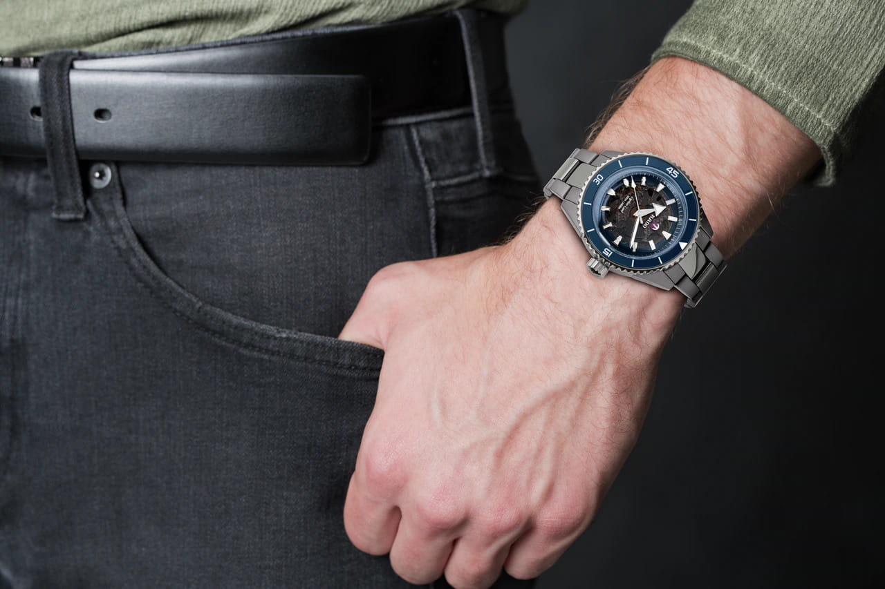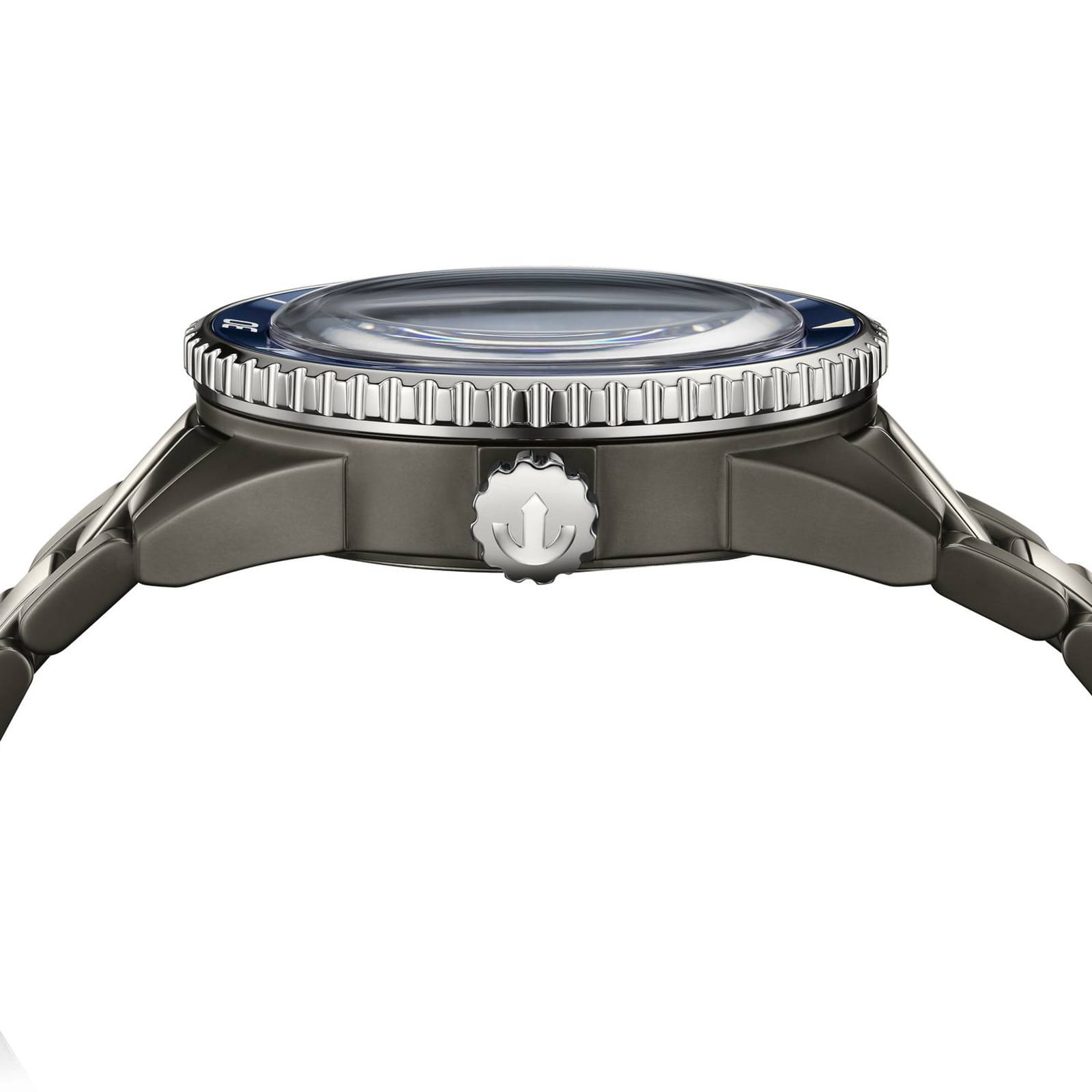 Премиальная модель обладает винтажным характером, синий циферблат обращает наше внимание на оригинальные стрелки в виде меча и стрелы. Часы обладают высокими показателями водонепроницаемости - сохранение герметичности до 20 бар, что стало возможным благодаря завинчивающейся задней крышке и заводной головке. Автоподзавод. Антибликовая обработка сапфирового стекла. Прочный керамический браслет. Отображение числа. Диаметр корпуса: 43 мм.