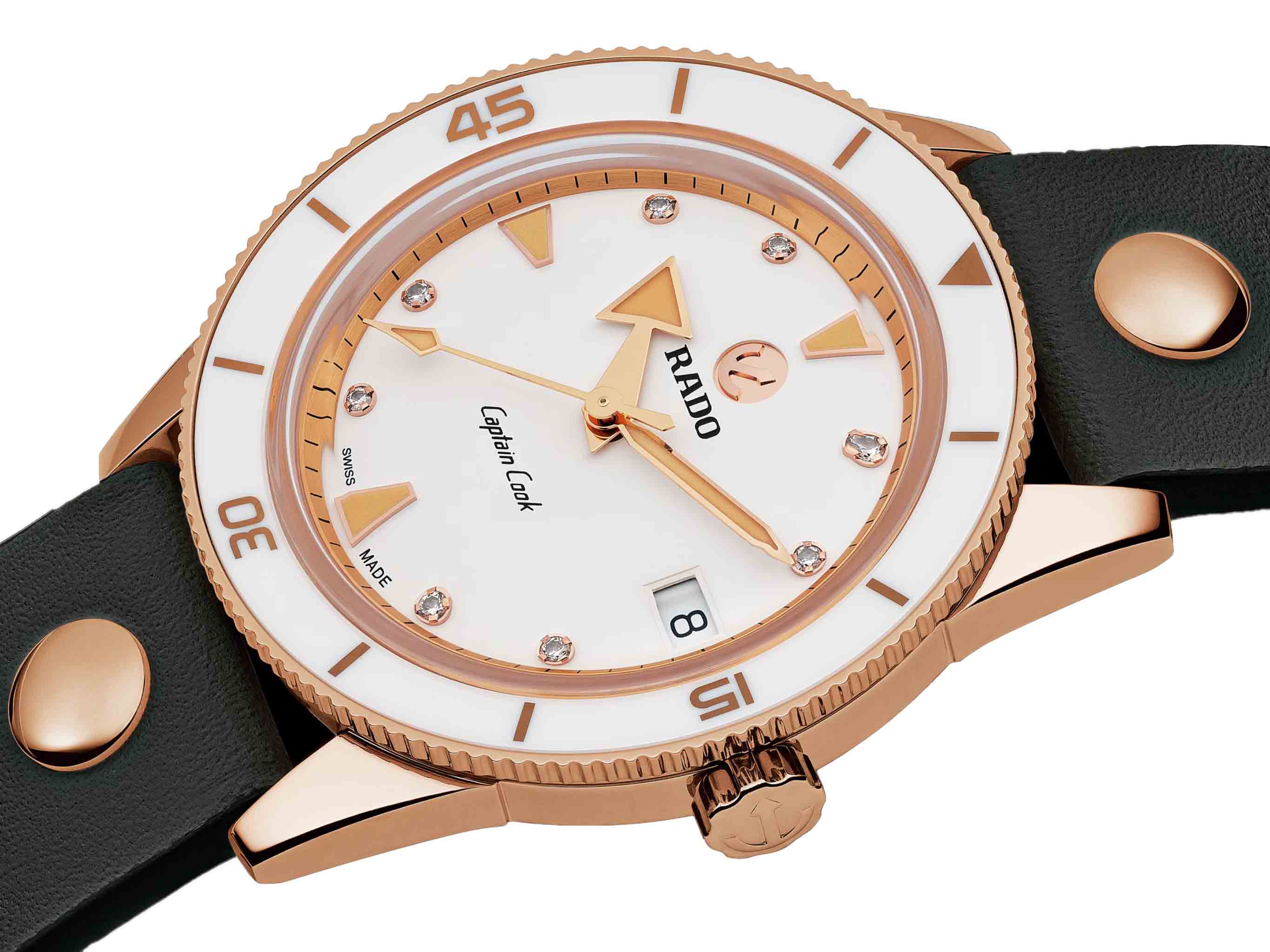 Современная интерпретация коллекции, выпускавшейся в 1960-х Rado Captain Cook Marina Hoermanseder R32139708, автоматический механизм с высокой точностью. Сапфировое стеклоСапфировое стеклоПрочный и надёжный материал из кристалла сапфира синтетического происхождения, характеризующийся особой твёрдостью и устойчивостью к царапинам и повреждениям. устойчивое к появлению царапин, обладающее высокой прозрачностью. Класс водозащиты: 100 метров, позволит плавать, нырять и заниматься другими водными видами спорта. Корпус часов изготовлен из керамики и нержавеющей стали с PVD-покрытиемPVDУльтратонкое покрытие наносится в технике вакуумного напыления, сочетает в себе нитрид титана особой прочности со слоем золота или оксида хрома. Несёт в себе декоративную или защитную функцию.. Поворотный безель из нержавеющей стали с PVD-покрытиемPVDУльтратонкое покрытие наносится в технике вакуумного напыления, сочетает в себе нитрид титана особой прочности со слоем золота или оксида хрома. Несёт в себе декоративную или защитную функцию.. Стрелки и метки с люминесцентным покрытиемЛюминесцентное покрытиеПозволяет считывать показания времени в темноте. Производители наносят на стрелки, часовые индексы, безель или поверхность циферблата светонакопительный состав, дающий холодное свечение.. Кожаный ремешок.