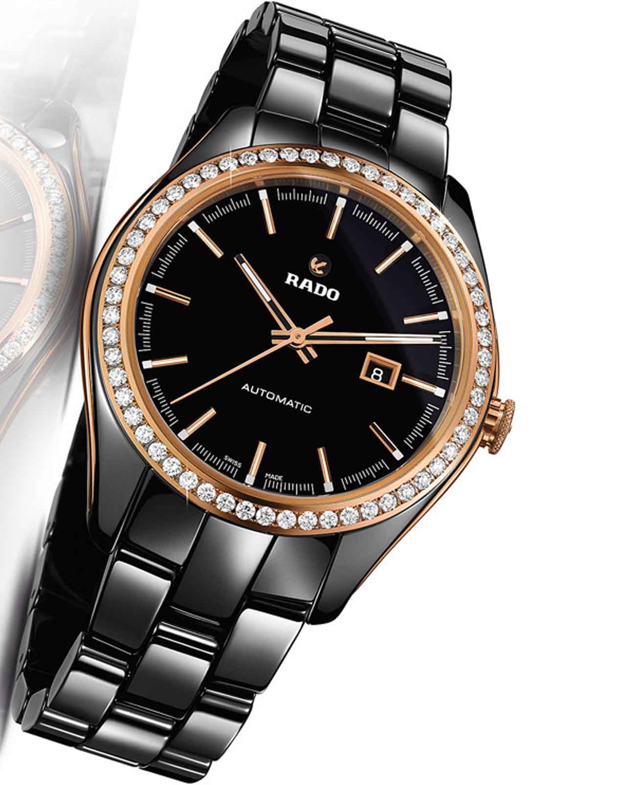 Женские механические швейцарские часы с автоподзаводом Rado Hyperchrome Automatic Diamonds R32526152. Сапфировое стеклоСапфировое стеклоПрочный и надёжный материал из кристалла сапфира синтетического происхождения, характеризующийся особой твёрдостью и устойчивостью к царапинам и повреждениям. устойчивое к мелким механическим повреждениям. Корпус часов изготовлен из нержавеющей стали с PVD-покрытиемPVDУльтратонкое покрытие наносится в технике вакуумного напыления, сочетает в себе нитрид титана особой прочности со слоем золота или оксида хрома. Несёт в себе декоративную или защитную функцию. и керамики. БезельБезельВнешний ободок, закрепляющий стекло. В спортивных часах так называется поворотное кольцо с делениями на циферблате, выполняет роль таймера – замеряет отрезки времени на шкале. Неподвижный безель – элемент декора. Однонаправленно вращающийся безель на дайверских часах позволяет фиксировать моменты погружения и выныривания на поверхность. из керамики украшен бриллиантами. Окошко даты находится в положении 3 часа. Стрелки с люминесцентным покрытиемЛюминесцентное покрытиеПозволяет считывать показания времени в темноте. Производители наносят на стрелки, часовые индексы, безель или поверхность циферблата светонакопительный состав, дающий холодное свечение.. Класс водозащиты: 50 метров, позволит защитить корпус от случайных брызг или капель дождя. Браслет из высокотехнологичной керамикиВысокотехнологичная керамикаИнновационный запатентованный Rado материал с гладкой или матовой поверхностью. Керамика за счёт кристаллической структуры обладает повышенной устойчивостью от возникновения царапин. Материал способен принимать температуру тела человека, обеспечивая невероятный комфорт при ношении. на раскладной застёжкеРаскладная застёжкаТакой тип застёжки используется только на браслетах из металла. Она никогда не раскрывается полностью, происходит разделение на 2 и более частей. Раскладывающая застёжка снизит вероятность потери часов к минимуму..