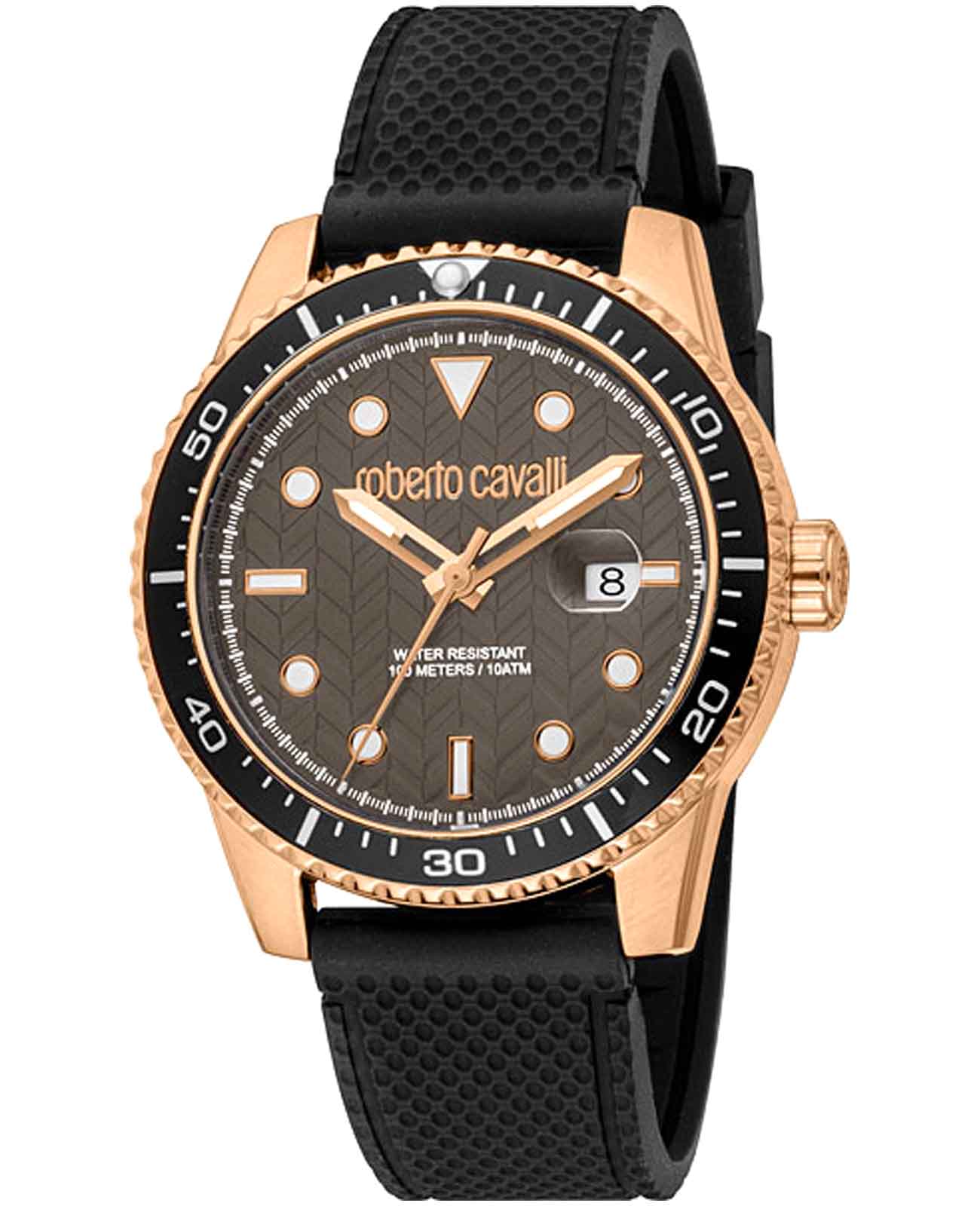 Погрузитесь в мир роскоши и безупречного стиля с мужскими наручными часами ROBERTO CAVALLI RC5G084P1035. Эти часы – воплощение смелого дизайна и итальянской элегантности, созданные для мужчины, который ценит внимание к деталям и не боится заявить о себе. Круглый корпус диаметром 42 мм выполнен из нержавеющей стали с PVD-покрытиемPVDУльтратонкое покрытие наносится в технике вакуумного напыления, сочетает в себе нитрид титана особой прочности со слоем золота или оксида хрома. Несёт в себе декоративную или защитную функцию., толщина корпуса составляет 11 мм, что придает модели выразительный внешний вид и надежную защиту от внешних воздействий. Циферблат, искусно оформленный фирменными элементами Roberto Cavalli, притягивает взгляд и подчеркивает ваш безупречный вкус. Часы оснащены кварцевым механизмом, также обладают функцией отображения даты, что делает их удобными для ежедневного использования. Минеральное стеклоМинеральное стеклоМинеральное стекло представляет собой искусственно выращенный минерал кварца. Такое стекло отличается особой устойчивостью к повреждениям и царапинам. Уступает по некоторым качествам сапфировому стеклу. защищает часы от царапин. Водозащита 100 метров, позволит плавать, нырять и заниматься другими водными видами спорта. Силиконовый ремешок на стандартной застёжке обеспечивает комфортное ношение. Поворотный безельБезельВнешний ободок, закрепляющий стекло. В спортивных часах так называется поворотное кольцо с делениями на циферблате, выполняет роль таймера – замеряет отрезки времени на шкале. Неподвижный безель – элемент декора. Однонаправленно вращающийся безель на дайверских часах позволяет фиксировать моменты погружения и выныривания на поверхность. с PVD-покрытиемPVDУльтратонкое покрытие наносится в технике вакуумного напыления, сочетает в себе нитрид титана особой прочности со слоем золота или оксида хрома. Несёт в себе декоративную или защитную функцию.. Стрелки и метки с люминесцентным покрытиемЛюминесцентное покрытиеПозволяет считывать показания времени в темноте. Производители наносят на стрелки, часовые индексы, безель или поверхность циферблата светонакопительный состав, дающий холодное свечение. обеспечивают отличную читаемость в любое время суток.