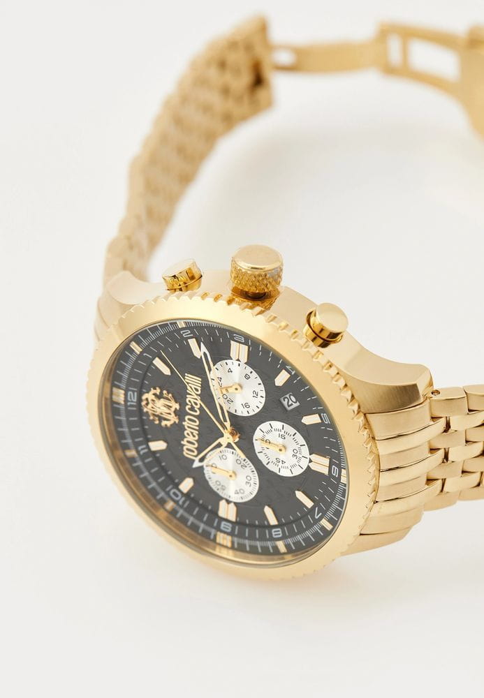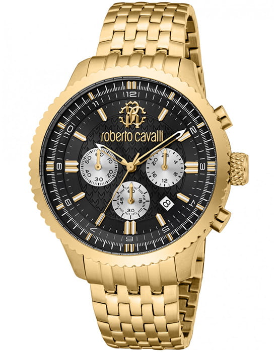 Roberto Cavalli Stile RC5G127M0075 — мужская кварцевая модель с ярко выраженным спортивным характером, сочетающая функциональность и надёжность. Корпус с PVD-покрытиемPVDУльтратонкое покрытие наносится в технике вакуумного напыления, сочетает в себе нитрид титана особой прочности со слоем золота или оксида хрома. Несёт в себе декоративную или защитную функцию. диаметром 44 мм выполнен из нержавеющей стали, сочетание матовых и полированных поверхностей придаёт часам современный вид. Защитную роль выполняет прочное минеральное стеклоМинеральное стеклоМинеральное стекло представляет собой искусственно выращенный минерал кварца. Такое стекло отличается особой устойчивостью к повреждениям и царапинам. Уступает по некоторым качествам сапфировому стеклу., устойчивое к повседневным воздействиям. Водозащита 100 м позволяет без опасений использовать модель во время плавания и активного отдыха. На циферблате реализованы функции хронографаХронографФункция позволяет измерять отрезки времени с особой точностью: часы, минуты, секунды. Верным признаком хронографа является наличие на циферблате 3 дополнительных окошек-счётчиков. и даты, благодаря чему часы сочетают спортивную эстетику и практичность. Стальной браслет с PVD-покрытиемPVDУльтратонкое покрытие наносится в технике вакуумного напыления, сочетает в себе нитрид титана особой прочности со слоем золота или оксида хрома. Несёт в себе декоративную или защитную функцию. на застёжке-бабочке с кнопкамиЗастёжка "бабочка"Такой вид застёжки дополняется предохранителями, помогающими избежать случайного раскрытия браслета. Обладают изящным исполнением. подчеркивает классический стиль, обеспечивает удобство в ношении и гармонично завершает дизайн, делая модель универсальным спутником как для повседневного образа, так и для активного досуга.
