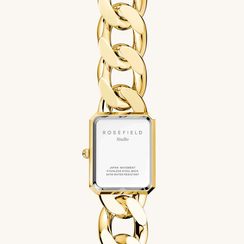 Часы Rosefield Octagon XS Studio (модель SWGSG-O55) — это элегантный женский аксессуар, сочетающий современный дизайн и высокое качество. Корпус восьмиугольной формы размером 19,5 x 24 мм выполнен из нержавеющей стали с PVD-покрытиемPVDУльтратонкое покрытие наносится в технике вакуумного напыления, сочетает в себе нитрид титана особой прочности со слоем золота или оксида хрома. Несёт в себе декоративную или защитную функцию. золотистого цвета, что придаёт часам утончённый и стильный вид. Белый циферблат с золотистыми часовыми метками и стрелками обеспечивает отличную читаемость. Циферблат защищён минеральным стекломМинеральное стеклоМинеральное стекло представляет собой искусственно выращенный минерал кварца. Такое стекло отличается особой устойчивостью к повреждениям и царапинам. Уступает по некоторым качествам сапфировому стеклу., устойчивым к царапинам.