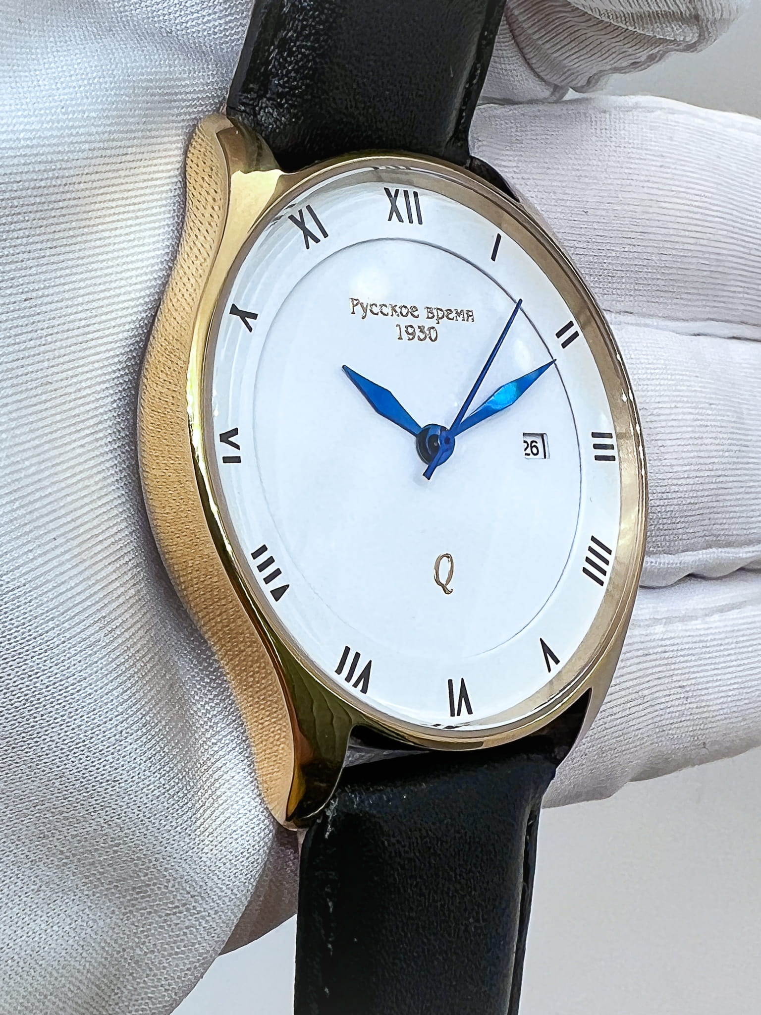 Стальной корпус круглой формы диаметром 38.2 мм и толщиной 9.2 мм выполнен из нержавеющей стали с частичным золотистым покрытием, что придает часам элегантный и премиальный вид. Циферблат белого цвета с римскими цифрами и метками в виде штрихов надежно защищен закаленным минеральным стекломМинеральное стеклоМинеральное стекло представляет собой искусственно выращенный минерал кварца. Такое стекло отличается особой устойчивостью к повреждениям и царапинам. Уступает по некоторым качествам сапфировому стеклу., что предотвращает появление царапин и повреждений.