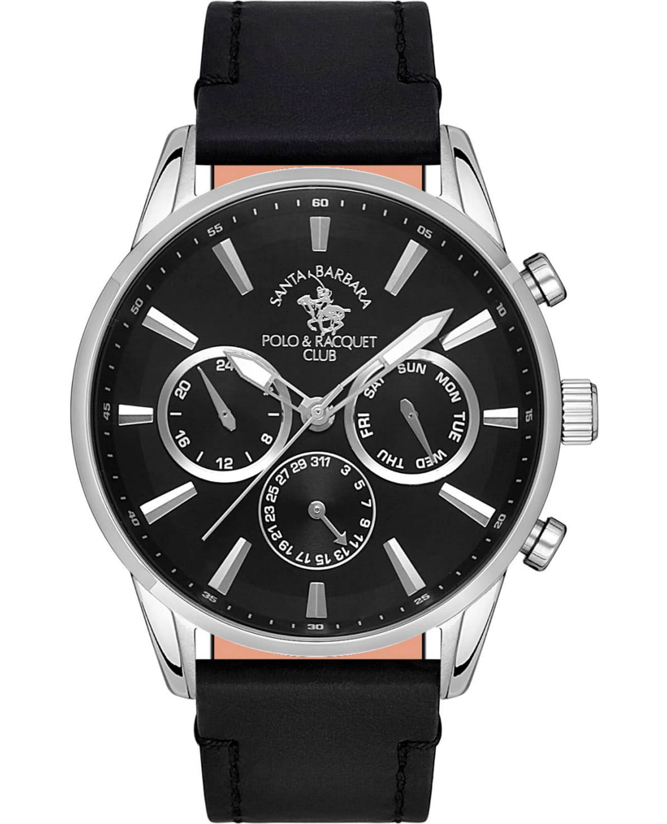 Мужские кварцевые часы Santa Barbara Polo & Racquet Club — это стильный и функциональный аксессуар для современного джентльмена. Корпус диаметром 44 мм выполнен из стали с матовой и полированной отделкой. Циферблат чёрного цвета оформлен по технологии Sunray («солнечные лучи»), дополнен накладными метками в виде штрихов и фирменным логотипом. Указатели дня недели и даты вынесены на отдельные субциферблаты, также присутствует индикация 24-часового формата времени. Стрелки мечевидной формы с люминесцентным покрытиемЛюминесцентное покрытиеПозволяет считывать показания времени в темноте. Производители наносят на стрелки, часовые индексы, безель или поверхность циферблата светонакопительный состав, дающий холодное свечение., обеспечивающим хорошую читаемость в темноте. Циферблат защищён минеральным стекломМинеральное стеклоМинеральное стекло представляет собой искусственно выращенный минерал кварца. Такое стекло отличается особой устойчивостью к повреждениям и царапинам. Уступает по некоторым качествам сапфировому стеклу.. Механизм — кварцевый калибр VX9JE. Часы оснащены кожаным ремешком с классической пряжкой. Водонепроницаемость 50 м позволяет использовать часы в повседневных условиях. Идеальный выбор для тех, кто ценит элегантность, точность и надёжность.