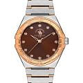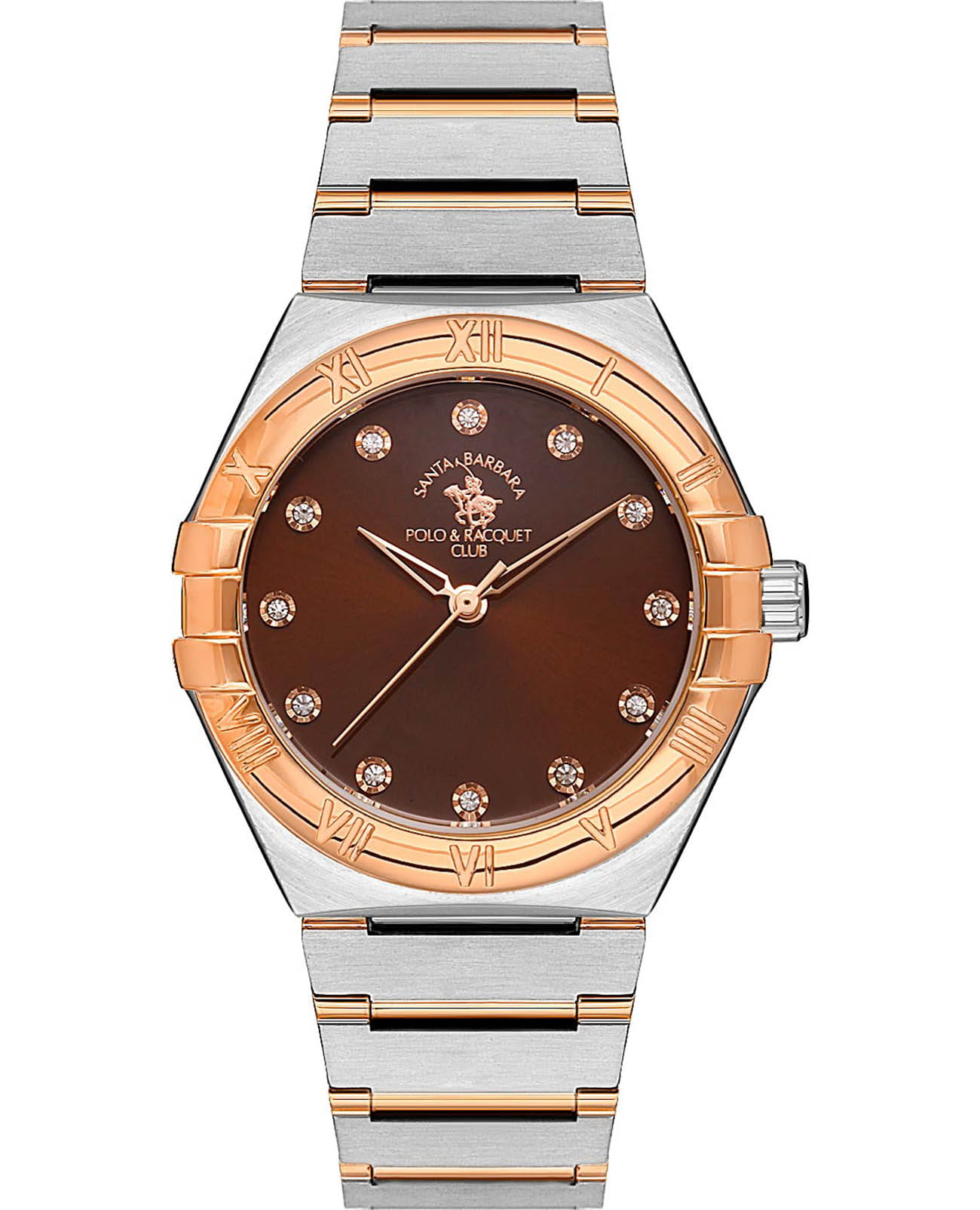 Женские кварцевые часы Santa Barbara Polo & Racquet Club — это элегантный аксессуар, притягивающий восхищённые взгляды. Корпус диаметром 34 мм и высотой 36 мм выполнен из нержавеющей стали. БезельБезельВнешний ободок, закрепляющий стекло. В спортивных часах так называется поворотное кольцо с делениями на циферблате, выполняет роль таймера – замеряет отрезки времени на шкале. Неподвижный безель – элемент декора. Однонаправленно вращающийся безель на дайверских часах позволяет фиксировать моменты погружения и выныривания на поверхность. с IP-покрытиемIP-покрытиеМетод ионного напыления. Демонстрирует повышенную устойчивость к истиранию, окислению и химическим веществам. Под воздействием высокого давления и температуры около 1500°C молекулы металла надёжно соединяются с частицами корпуса часов. оформлен римскими цифрами, придавая дизайну классическую выразительность. Циферблат коричневого цвета выполнен по технологии Sunray («солнечные лучи»), дополнен накладными метками в виде точек, инкрустированных кристаллами, а также фирменным логотипом. Циферблат защищён минеральным стекломМинеральное стеклоМинеральное стекло представляет собой искусственно выращенный минерал кварца. Такое стекло отличается особой устойчивостью к повреждениям и царапинам. Уступает по некоторым качествам сапфировому стеклу.. Механизм — кварцевый калибр Miyota 2035. Часы оснащены стальным браслетом с частичным IP-покрытиемIP-покрытиеМетод ионного напыления. Демонстрирует повышенную устойчивость к истиранию, окислению и химическим веществам. Под воздействием высокого давления и температуры около 1500°C молекулы металла надёжно соединяются с частицами корпуса часов. и раскладной застёжкойРаскладная застёжкаТакой тип застёжки используется только на браслетах из металла. Она никогда не раскрывается полностью, происходит разделение на 2 и более частей. Раскладывающая застёжка снизит вероятность потери часов к минимуму.. Водонепроницаемость 50 м позволяет использовать часы в повседневных условиях. Идеальный выбор для тех, кто ценит блеск, стиль и качество.