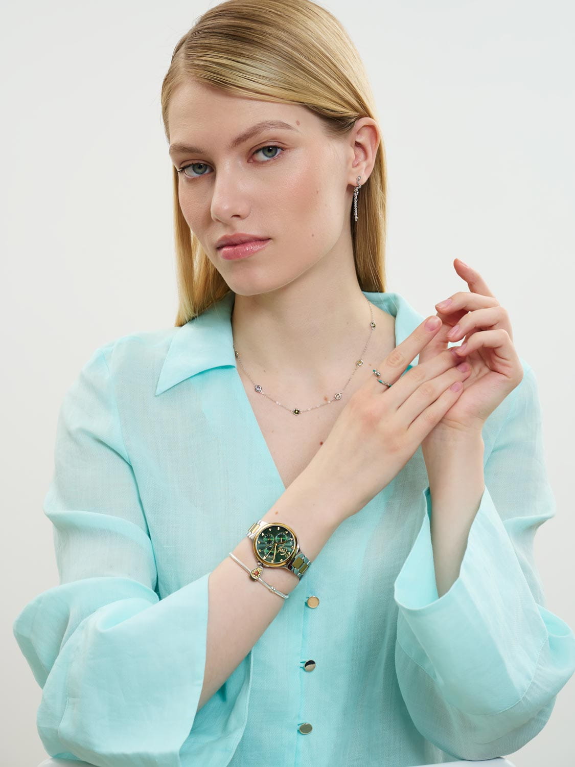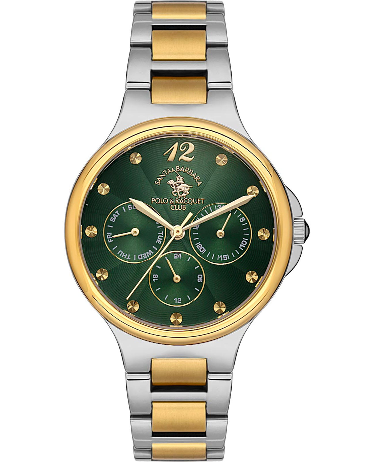 Женские кварцевые часы Santa Barbara Polo & Racquet Club — это элегантный аксессуар, подчеркивающий романтичное настроение. Корпус диаметром 35 мм и высотой 42 мм выполнен из латуни. Безель с IP-покрытиемIP-покрытиеМетод ионного напыления. Демонстрирует повышенную устойчивость к истиранию, окислению и химическим веществам. Под воздействием высокого давления и температуры около 1500°C молекулы металла надёжно соединяются с частицами корпуса часов.. Циферблат зелёного цвета с гильошированной текстурой украшен фирменным логотипом и накладными метками в виде точек, а также арабской цифрой 12. Указатели дня недели и даты вынесены на отдельные субциферблаты, также присутствует индикация 24-часового формата времени. Циферблат защищён минеральным стекломМинеральное стеклоМинеральное стекло представляет собой искусственно выращенный минерал кварца. Такое стекло отличается особой устойчивостью к повреждениям и царапинам. Уступает по некоторым качествам сапфировому стеклу.. Механизм — кварцевый калибр VX3JE1. Часы оснащены браслетом из нержавеющей стали с частичным IP-покрытиемIP-покрытиеМетод ионного напыления. Демонстрирует повышенную устойчивость к истиранию, окислению и химическим веществам. Под воздействием высокого давления и температуры около 1500°C молекулы металла надёжно соединяются с частицами корпуса часов. на раскладной застёжкеРаскладная застёжкаТакой тип застёжки используется только на браслетах из металла. Она никогда не раскрывается полностью, происходит разделение на 2 и более частей. Раскладывающая застёжка снизит вероятность потери часов к минимуму.. Водонепроницаемость 50 м позволяет использовать часы в повседневных условиях. Идеальный выбор для тех, кто ценит женственность, стиль и качество.