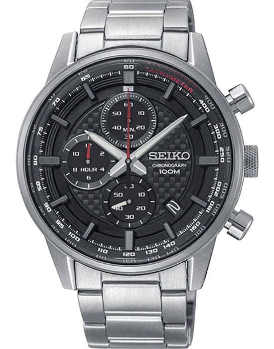 Аксессуар с текстурой циферблата под карбон выполнен из нержавеющей стали 316L, материал устойчив к царапинам и повреждениям. Кварцевый хронографХронографФункция позволяет измерять отрезки времени с особой точностью: часы, минуты, секунды. Верным признаком хронографа является наличие на циферблате 3 дополнительных окошек-счётчиков. оснащён японским механизмом Seiko 8T67 с точностью хода ±15 секунд в месяц. Калибр работает от батарейки, рассчитанной на 3 года. Функции: секундомер, календарь, тахиметрТахиметрРазмеченная шкала, располагается на ободке или безеле часов. Тахиметр позволяет рассчитать скорость на определённом участке пути, расстояние измеряется в километрах или милях..