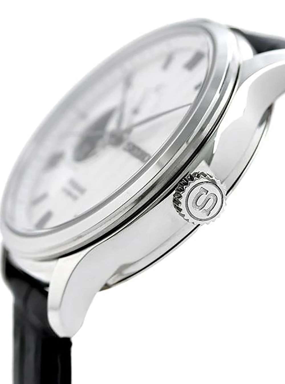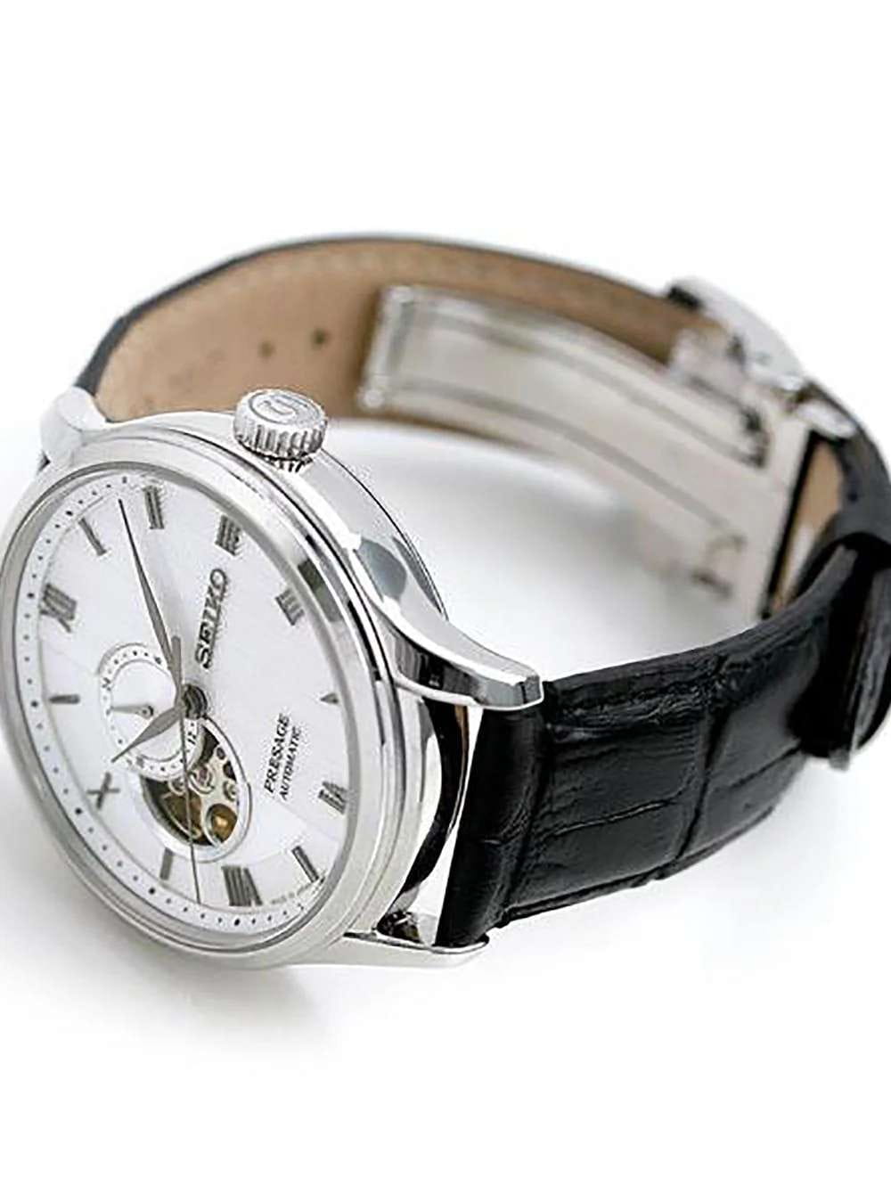 Мужские механические часы с автоподзаводом Seiko SARY095 — элегантное сочетание японской инженерии и классического дизайна. Круглый корпус размером 41 мм из нержавеющей стали, белый циферблат с римскими цифрами и частично скелетонизированным циферблатом, а также 24-часовой стрелкой. Стекло — сапфировоеСапфировое стеклоПрочный и надёжный материал из кристалла сапфира синтетического происхождения, характеризующийся особой твёрдостью и устойчивостью к царапинам и повреждениям.. Механизм японский калибр 4R39 (24 камня, запас хода 41 час), с функцией stop-second и возможностью ручного завода. Водонепроницаемость 30 м. Ремешок чёрный кожаный на раскладной застёжкеРаскладная застёжкаТакой тип застёжки используется только на браслетах из металла. Она никогда не раскрывается полностью, происходит разделение на 2 и более частей. Раскладывающая застёжка снизит вероятность потери часов к минимуму.. Задняя крышка — прозрачная и завинчивающаяся. Идеальный выбор для тех, кто ценит японское качество и классический стиль.