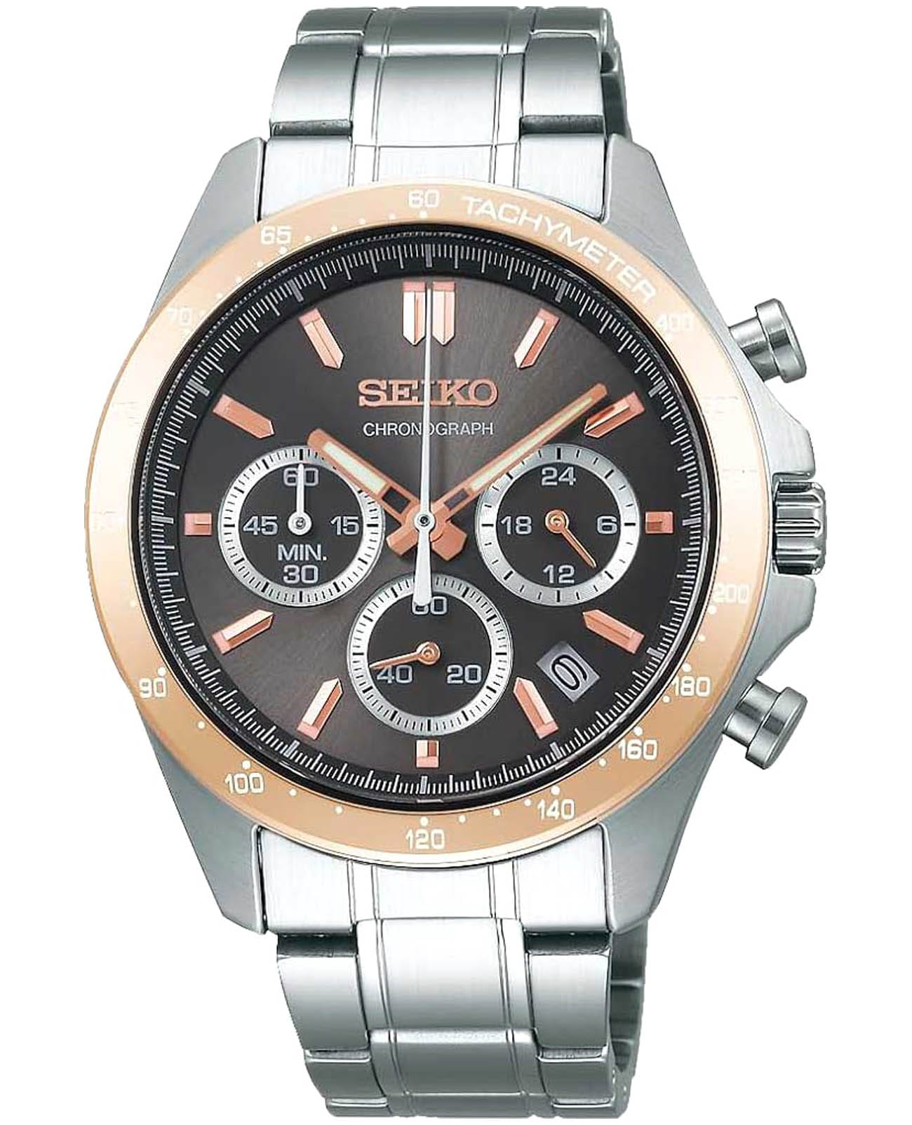 Мужские японские часы-хронографХронографФункция позволяет измерять отрезки времени с особой точностью: часы, минуты, секунды. Верным признаком хронографа является наличие на циферблате 3 дополнительных окошек-счётчиков. с секундомеромСекундомерСекундоме́р — прибор, способный измерять интервалы времени с точностью до долей секунды. Seiko Spirit Chronograph SBTR026 — это великолепное сочетание стиля и функциональности, созданное для современных искателей приключений. Минеральное стеклоМинеральное стеклоМинеральное стекло представляет собой искусственно выращенный минерал кварца. Такое стекло отличается особой устойчивостью к повреждениям и царапинам. Уступает по некоторым качествам сапфировому стеклу. с повышенной прочности Hardlex гарантирует защиту циферблата от царапин, сохраняя их безупречный вид на протяжении долгого времени. Внутри этих часов установлен кварцевый механизм, который обеспечивает высокую точность и надежность, позволяя вам всегда оставаться в курсе времени. Класс водозащиты в 100 метров позволяет вам не только плавать и нырять, но и заниматься разнообразными водными видами спорта, уверенно полагаясь на это надежное устройство, которое выдержит даже самые экстремальные условия. Корпус и браслет часов изготовлены из прочной нержавеющей стали, что укрепляет их долговечность и подчеркивает современный дизайн. Неподвижный безельБезельВнешний ободок, закрепляющий стекло. В спортивных часах так называется поворотное кольцо с делениями на циферблате, выполняет роль таймера – замеряет отрезки времени на шкале. Неподвижный безель – элемент декора. Однонаправленно вращающийся безель на дайверских часах позволяет фиксировать моменты погружения и выныривания на поверхность. с PVD-покрытиемPVDУльтратонкое покрытие наносится в технике вакуумного напыления, сочетает в себе нитрид титана особой прочности со слоем золота или оксида хрома. Несёт в себе декоративную или защитную функцию. цвета розового золота, диаметр 42 мм. Шкала тахиметраТахиметрРазмеченная шкала, располагается на ободке или безеле часов. Тахиметр позволяет рассчитать скорость на определённом участке пути, расстояние измеряется в километрах или милях. по внешнему краю. Удобное окошко даты в позиции между 4 и 5 часов, делает эти часы еще более практичными, позволяя быстро сверять текущую дату. Кроме того, стрелки и метки часов оснащены люминесцентным покрытиемЛюминесцентное покрытиеПозволяет считывать показания времени в темноте. Производители наносят на стрелки, часовые индексы, безель или поверхность циферблата светонакопительный состав, дающий холодное свечение., что обеспечивает отличную видимость даже в условиях низкой освещенности, поэтому вы всегда сможете узнать время, независимо от окружающей среды. Стальной браслет на раскладной застёжкеРаскладная застёжкаТакой тип застёжки используется только на браслетах из металла. Она никогда не раскрывается полностью, происходит разделение на 2 и более частей. Раскладывающая застёжка снизит вероятность потери часов к минимуму. обеспечивает комфорт и удобство в использовании, добавляя завершающий штрих к этому стильному и высокоэффективному аксессуару.