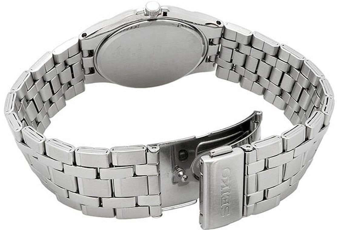 Мужские кварцевые часы Seiko — это надёжный и универсальный аксессуар. Корпус диаметром 36 мм выполнен из нержавеющей стали 316L. Циферблат чёрного цвета оформлен индексами и стрелками, включая центральную секундную стрелку. Циферблат защищён прочным закалённым минеральным стеклом Hardlex минеральным стекломМинеральное стеклоМинеральное стекло представляет собой искусственно выращенный минерал кварца. Такое стекло отличается особой устойчивостью к повреждениям и царапинам. Уступает по некоторым качествам сапфировому стеклу.. Механизм — кварцевый калибр 7N01 с высокой точностью хода (±10–15 сек. в месяц). Часы оснащены стальным браслетом на раскладной застёжкеРаскладная застёжкаТакой тип застёжки используется только на браслетах из металла. Она никогда не раскрывается полностью, происходит разделение на 2 и более частей. Раскладывающая застёжка снизит вероятность потери часов к минимуму. с фиксатором. Водонепроницаемость 50 м позволяет использовать часы в повседневных условиях. Идеальный выбор для тех, кто ценит японское качество и классический дизайн.