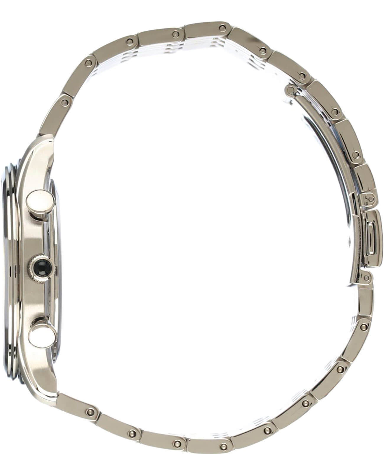Элегантный хронографХронографФункция позволяет измерять отрезки времени с особой точностью: часы, минуты, секунды. Верным признаком хронографа является наличие на циферблате 3 дополнительных окошек-счётчиков. дополнен яркими акцентами и спортивными деталями: шкала тахиметраТахиметрРазмеченная шкала, располагается на ободке или безеле часов. Тахиметр позволяет рассчитать скорость на определённом участке пути, расстояние измеряется в километрах или милях., отображение даты, ретроградный указатель дня недели, окошко будильника и секундомера. Аксессуар будет одинаково хорошо дополнять как повседневный, так и деловой образ. Серебристый стальной браслет гармонично сочетается с отполированным кабашоном на заводной головке. Циферблат защищён прочным минеральным стеклом Hardlex, отличающимся устойчивостью к царапинам. В основе работы – кварцевый японский механизм Seiko 7T86. Надёжный корпус из нержавеющей стали 316L выдерживает высокие нагрузки. Наручные часы сохраняют водонепроницаемость при давлении 50 бар. Диаметр корпуса: 40 мм.