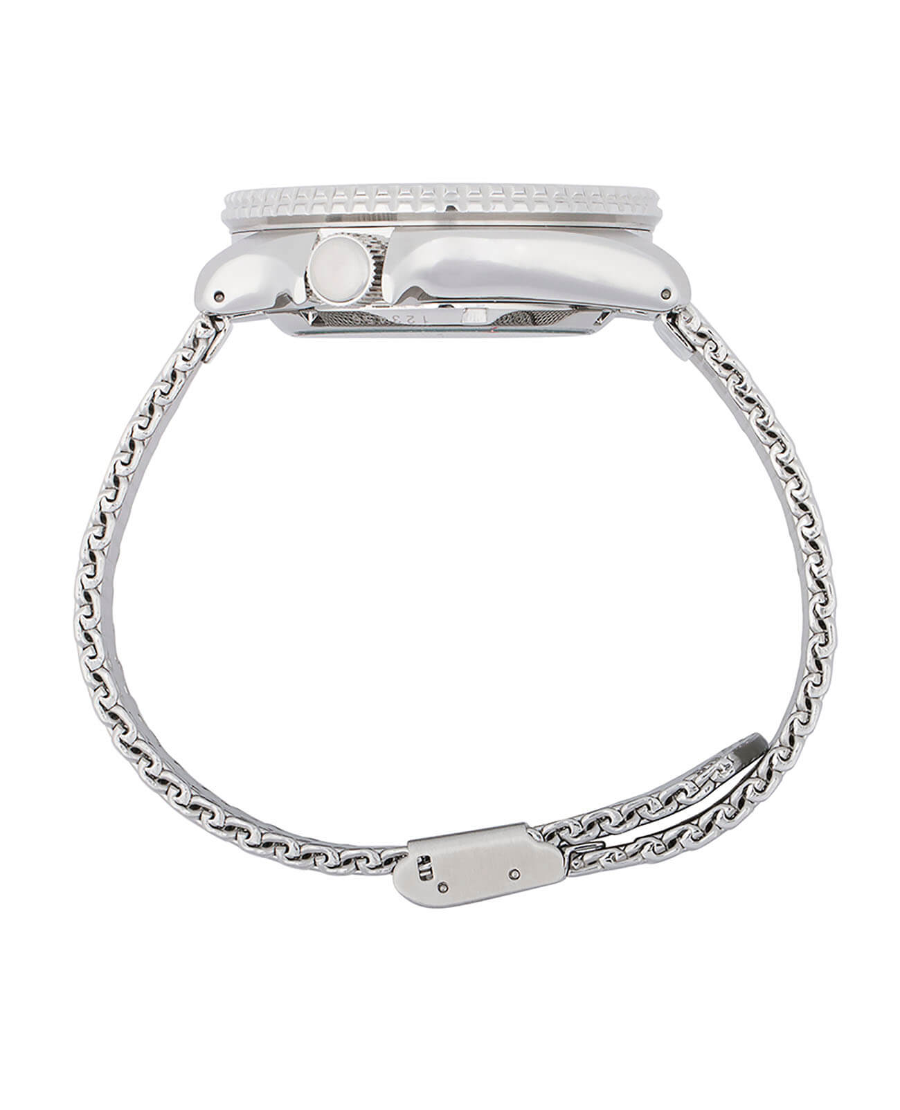 Водозащита 100 метров (10 атм) позволяет использовать часы для плавания и других водных видов спорта. Стальной браслет с миланским плетением и раскладной застёжкой Раскладная застёжкаРаскладная застёжкаТакой тип застёжки используется только на браслетах из металла. Она никогда не раскрывается полностью, происходит разделение на 2 и более частей. Раскладывающая застёжка снизит вероятность потери часов к минимуму. обеспечивает комфортное ношение и надёжную фиксацию на запястье.