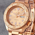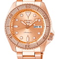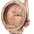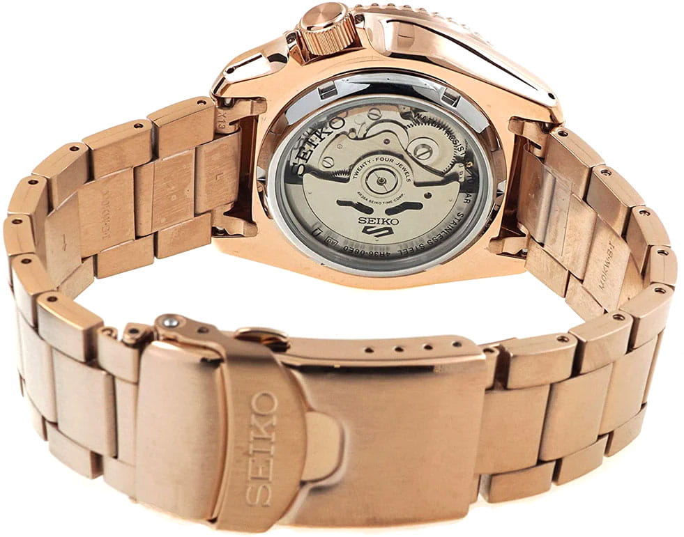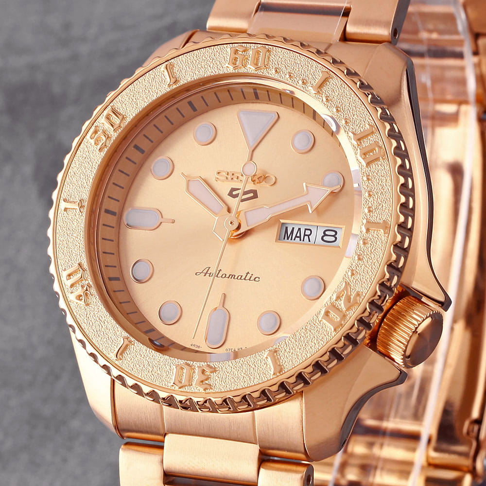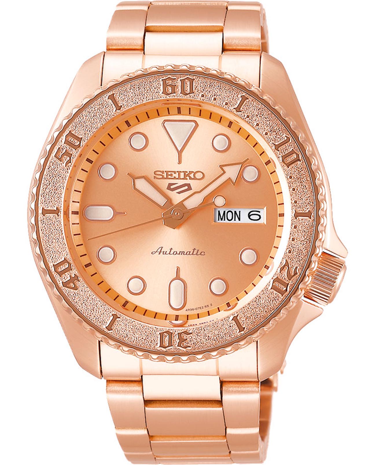 Часы Seiko 5 Sports SRPE72K1 представляют собой элегантное сочетание классического дизайна и современных технологий. Корпус диаметром 42,5 мм выполнен из нержавеющей стали с PVD-покрытиемPVDУльтратонкое покрытие наносится в технике вакуумного напыления, сочетает в себе нитрид титана особой прочности со слоем золота или оксида хрома. Несёт в себе декоративную или защитную функцию. розового цвета, придающим часам утончённый вид. Циферблат розового цвета защищён минеральным стекломМинеральное стеклоМинеральное стекло представляет собой искусственно выращенный минерал кварца. Такое стекло отличается особой устойчивостью к повреждениям и царапинам. Уступает по некоторым качествам сапфировому стеклу. с повышенной прочностью.