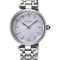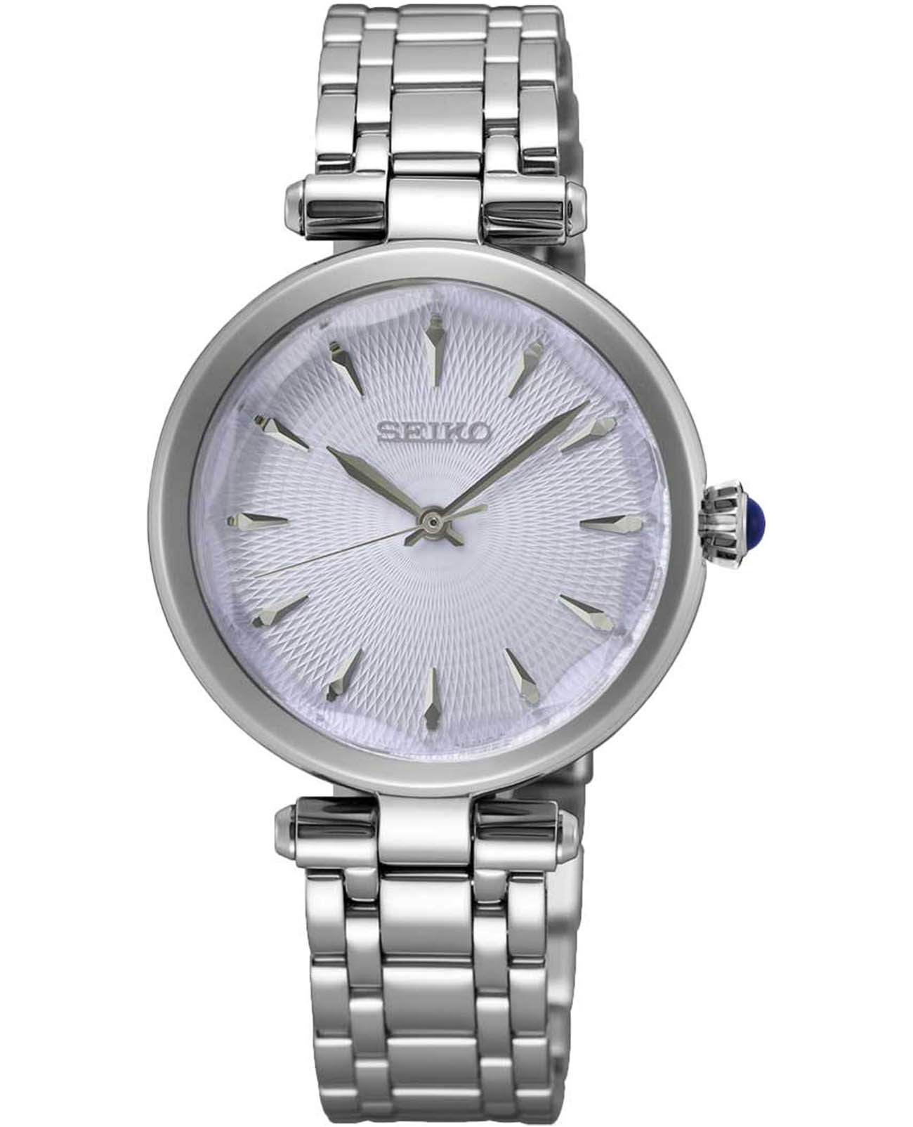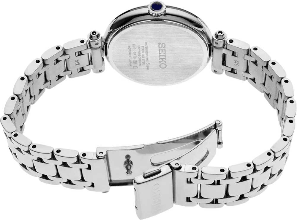 Женские японские часы Seiko Discover More SRZ553 c кварцевым механизмом с высокой точностью. Минеральное стеклоМинеральное стеклоМинеральное стекло представляет собой искусственно выращенный минерал кварца. Такое стекло отличается особой устойчивостью к повреждениям и царапинам. Уступает по некоторым качествам сапфировому стеклу., устойчивое к появлению царапин, обладающее высокой прозрачностью. Класс водозащиты: 50 метров, позволит плавать, нырять и заниматься другими водными видами спорта. Серебристый корпус и браслет часов изготовлен из нержавеющей стали. Заводная головка украшена камнем в форме кабошона. Браслет с тройной раскладной застёжкойРаскладная застёжкаТакой тип застёжки используется только на браслетах из металла. Она никогда не раскрывается полностью, происходит разделение на 2 и более частей. Раскладывающая застёжка снизит вероятность потери часов к минимуму.. Seiko — это гармония изящного дизайна и технологичной надёжности, компактный и стильный выбор для повседневной классики.