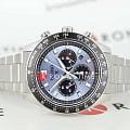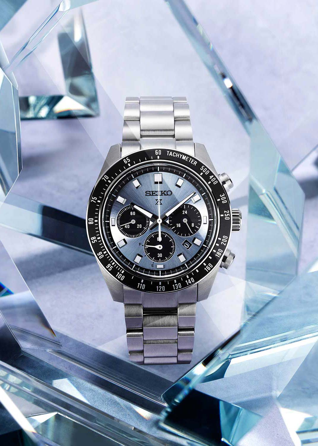 Модель Seiko SSC935P1 из коллекции Prospex Speedtimer — это спортивный солнечный хронограф с выразительным дизайном и высокой функциональностью. Корпус диаметром 41,4 мм выполнен из нержавеющей стали и оснащён завинчивающейся задней крышкой и заводной головкой, обеспечивая водозащиту до 100 метров. Фиксированный алюминиевый тахиметрический безельТахиметрРазмеченная шкала, располагается на ободке или безеле часов. Тахиметр позволяет рассчитать скорость на определённом участке пути, расстояние измеряется в километрах или милях. позволяет производить измерения скорости. Циферблат насыщенного голубого оттенка с солнечным финишем дополнен тремя чёрными счётчиками: 24-часовым, малой секундной стрелкой и хронографом на 60 минут. Стрелки и индексы покрыты люминесцентным покрытиемЛюминесцентное покрытиеПозволяет считывать показания времени в темноте. Производители наносят на стрелки, часовые индексы, безель или поверхность циферблата светонакопительный состав, дающий холодное свечение. LumiBrite для превосходной видимости в тёмное время суток. Защиту циферблата обеспечивает выпуклое сапфировое стеклоСапфировое стеклоПрочный и надёжный материал из кристалла сапфира синтетического происхождения, характеризующийся особой твёрдостью и устойчивостью к царапинам и повреждениям. с внутренним антибликовым покрытиемАнтибликовое покрытиеСлой оксида металла в 0,13-0,3 микрон, благодаря которому стекло часов не бликует и не отражает свет. Антибликовое покрытие уменьшает отражение света в 10 раз, обеспечивая отличную читаемость показателей циферблата., устойчивое к царапинам и бликам. Внутри установлен солнечный кварцевый калибр V192 с функциями хронографаХронографФункция позволяет измерять отрезки времени с особой точностью: часы, минуты, секунды. Верным признаком хронографа является наличие на циферблате 3 дополнительных окошек-счётчиков., индикацией 24 часов, даты и запаса хода. Полного заряда хватает до 6 месяцев автономной работы. Браслет из нержавеющей стали надёжно фиксируется при помощи раскладной застёжкиРаскладная застёжкаТакой тип застёжки используется только на браслетах из металла. Она никогда не раскрывается полностью, происходит разделение на 2 и более частей. Раскладывающая застёжка снизит вероятность потери часов к минимуму. с кнопками.