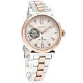 Женские механические часы с автоподзаводом Seiko — это элегантный аксессуар. Корпус диаметром 34,6 мм и толщиной 11 мм выполнен из нержавеющей стали. БезельБезельВнешний ободок, закрепляющий стекло. В спортивных часах так называется поворотное кольцо с делениями на циферблате, выполняет роль таймера – замеряет отрезки времени на шкале. Неподвижный безель – элемент декора. Однонаправленно вращающийся безель на дайверских часах позволяет фиксировать моменты погружения и выныривания на поверхность. с PVD-покрытиемPVDУльтратонкое покрытие наносится в технике вакуумного напыления, сочетает в себе нитрид титана особой прочности со слоем золота или оксида хрома. Несёт в себе декоративную или защитную функцию. цвета розового золота. Циферблат белого цвета оформлен индексами, стрелками и эффектом открытого баланса (скелетон). Циферблат украшен кристаллами. Стрелки и метки с люминесцентным покрытиемЛюминесцентное покрытиеПозволяет считывать показания времени в темноте. Производители наносят на стрелки, часовые индексы, безель или поверхность циферблата светонакопительный состав, дающий холодное свечение., обеспечивающим хорошую читаемость в темноте. Циферблат защищён сапфировым стекломСапфировое стеклоПрочный и надёжный материал из кристалла сапфира синтетического происхождения, характеризующийся особой твёрдостью и устойчивостью к царапинам и повреждениям., устойчивым к царапинам. Механизм — автоматический калибр 4R38 (24 камня, частота 21 600 полуколебаний в час) с функцией остановки секундной стрелки и запасом хода до 41 часа. Часы оснащены стальным браслетом с частичным PVD-покрытиемPVDУльтратонкое покрытие наносится в технике вакуумного напыления, сочетает в себе нитрид титана особой прочности со слоем золота или оксида хрома. Несёт в себе декоративную или защитную функцию. на раскладной застёжкеРаскладная застёжкаТакой тип застёжки используется только на браслетах из металла. Она никогда не раскрывается полностью, происходит разделение на 2 и более частей. Раскладывающая застёжка снизит вероятность потери часов к минимуму.. Водонепроницаемость 100 м позволяет использовать часы для плавания и повседневного ношения. Идеальный выбор для тех, кто ценит японское качество и безупречный стиль.
