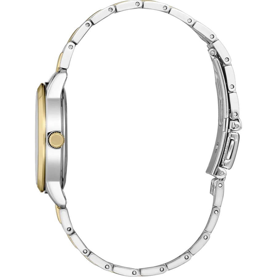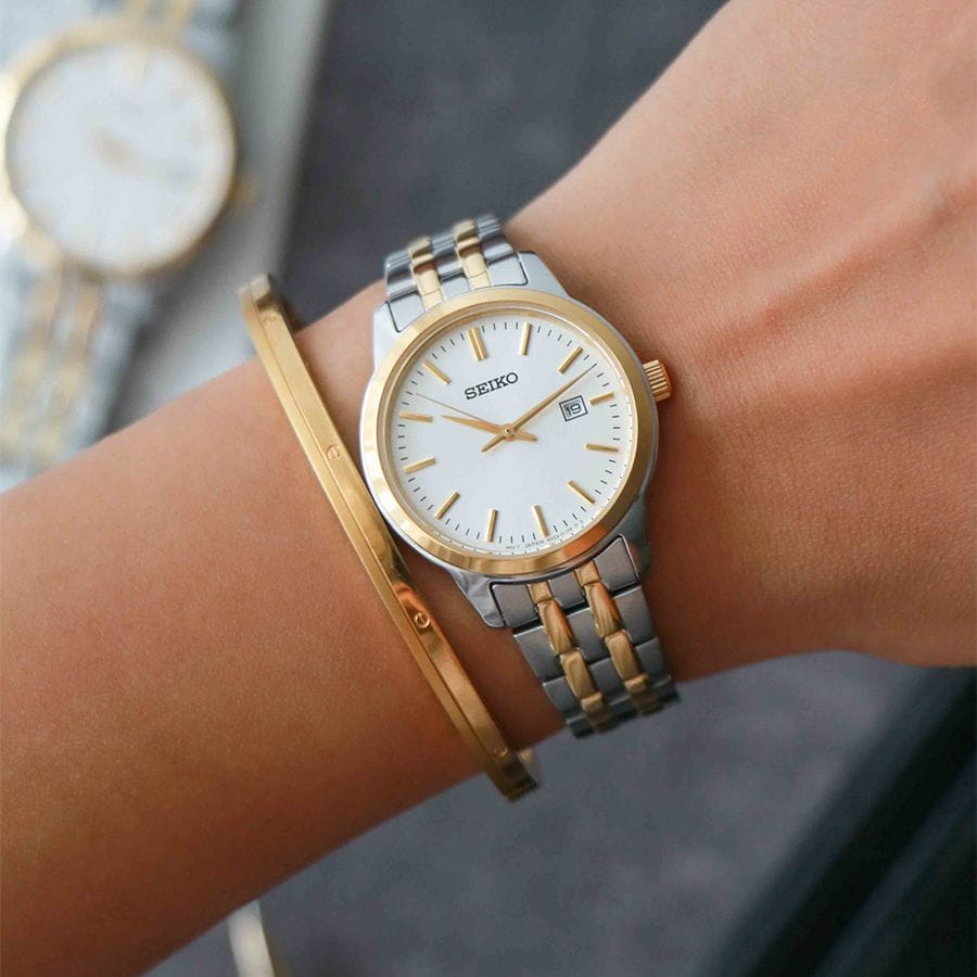 Женские японские часы Seiko Discover More SUR410P1 c кварцевым механизмом с высокой точностью с калибром 6N22. Минеральное стеклоМинеральное стеклоМинеральное стекло представляет собой искусственно выращенный минерал кварца. Такое стекло отличается особой устойчивостью к повреждениям и царапинам. Уступает по некоторым качествам сапфировому стеклу. с повышенной прочностью Hardlex устойчивое к появлению царапин, обладающее высокой прозрачностью. Водозащита до 5 ATM позволяет не снимать часы при дожде, мытье рук или случайных брызгах. Корпус диаметром 30 мм и браслет изготовлены из нержавеющей стали с PVDPVDУльтратонкое покрытие наносится в технике вакуумного напыления, сочетает в себе нитрид титана особой прочности со слоем золота или оксида хрома. Несёт в себе декоративную или защитную функцию. покрытием. Браслет с раскладной застёжкойРаскладная застёжкаТакой тип застёжки используется только на браслетах из металла. Она никогда не раскрывается полностью, происходит разделение на 2 и более частей. Раскладывающая застёжка снизит вероятность потери часов к минимуму. с фиксатором. Белый циферблат с метками в виде штрихов, окошко с датой находится в позиции 3 часов. Seiko — это гармония изящного дизайна и технологичной надёжности, компактный и стильный выбор для повседневной классики.