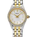 Женские японские часы Seiko Discover More SUR540P1 c кварцевым механизм с высокой точностью. Минеральное стеклоМинеральное стеклоМинеральное стекло представляет собой искусственно выращенный минерал кварца. Такое стекло отличается особой устойчивостью к повреждениям и царапинам. Уступает по некоторым качествам сапфировому стеклу. выпуклое повышенной прочности Hardlex, устойчивое к появлению царапин, обладающее высокой прозрачностью. Класс водозащиты: 30 метров. Корпус, украшенный 45 кристаллами, и браслет часов изготовлен из стали с PVDPVDУльтратонкое покрытие наносится в технике вакуумного напыления, сочетает в себе нитрид титана особой прочности со слоем золота или оксида хрома. Несёт в себе декоративную или защитную функцию. покрытием. Белый циферблат с метками в виде штрихов. Браслет с тройной раскладной застёжкойРаскладная застёжкаТакой тип застёжки используется только на браслетах из металла. Она никогда не раскрывается полностью, происходит разделение на 2 и более частей. Раскладывающая застёжка снизит вероятность потери часов к минимуму.. Seiko — это гармония изящного дизайна и технологичной надёжности, компактный и стильный выбор для повседневной классики.