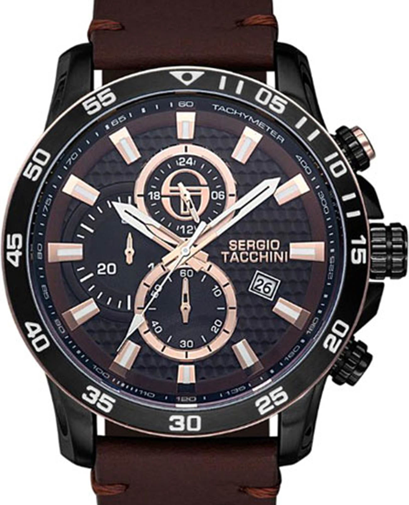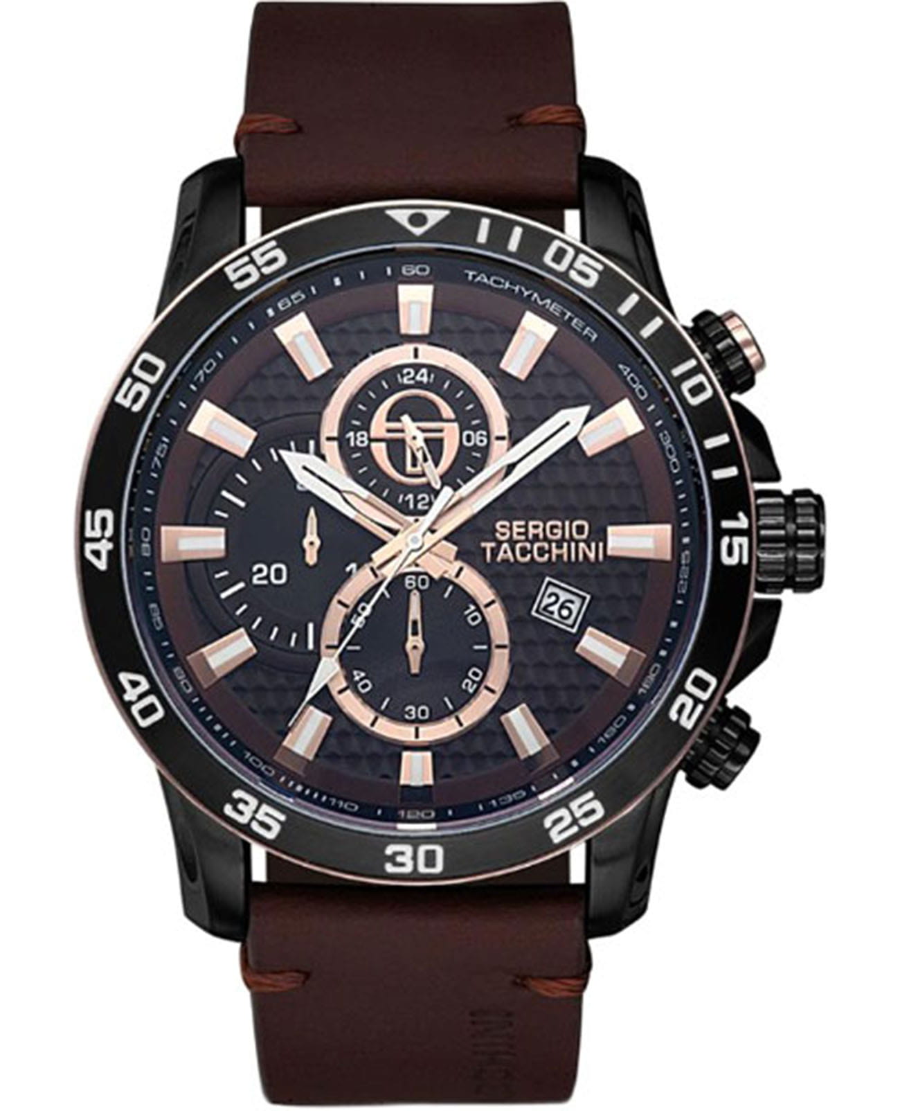 Мужские кварцевые часы Sergio Tacchini из коллекции Archivio — это выразительный спортивный аксессуар с функцией хронографа. Корпус диаметром 46 мм выполнен из нержавеющей стали 316L с PVD-покрытиемPVDУльтратонкое покрытие наносится в технике вакуумного напыления, сочетает в себе нитрид титана особой прочности со слоем золота или оксида хрома. Несёт в себе декоративную или защитную функцию.. Циферблат коричневого цвета оформлен тремя субциферблатами хронографа, шкалой тахиметраТахиметрРазмеченная шкала, располагается на ободке или безеле часов. Тахиметр позволяет рассчитать скорость на определённом участке пути, расстояние измеряется в километрах или милях. и индикацией 24-часового формата времени. Окошко даты расположено в положении 4 часов. Циферблат защищён минеральным стекломМинеральное стеклоМинеральное стекло представляет собой искусственно выращенный минерал кварца. Такое стекло отличается особой устойчивостью к повреждениям и царапинам. Уступает по некоторым качествам сапфировому стеклу. с антибликовым покрытиемАнтибликовое покрытиеСлой оксида металла в 0,13-0,3 микрон, благодаря которому стекло часов не бликует и не отражает свет. Антибликовое покрытие уменьшает отражение света в 10 раз, обеспечивая отличную читаемость показателей циферблата.. Механизм — японский кварцевый калибр Miyota JS15. Часы оснащены кожаным ремешком коричневого цвета с стандартной застёжкой. Водонепроницаемость 100 м позволяет использовать часы для плавания и повседневного ношения. Идеальный выбор для тех, кто ценит стиль, функциональность и точность.