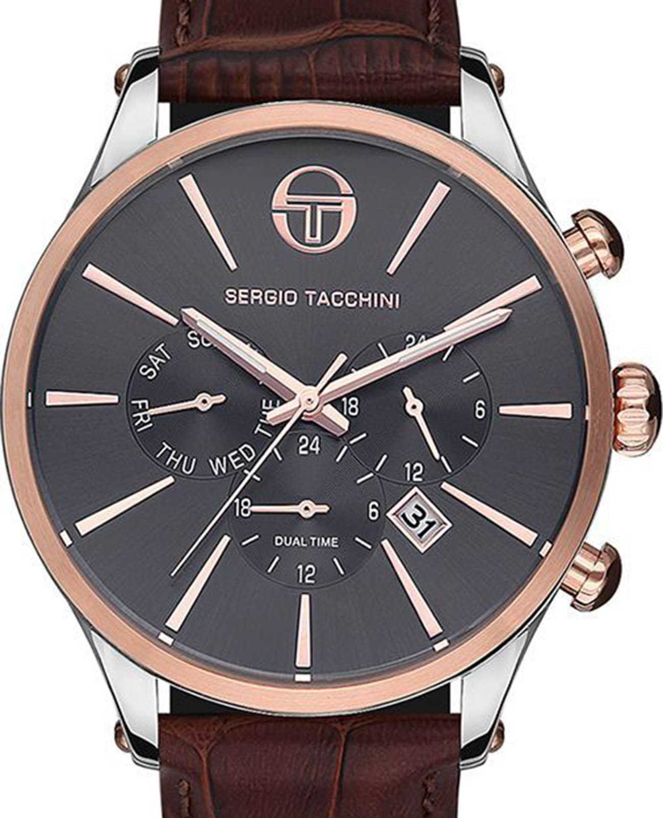 Мужские кварцевые часы Sergio Tacchini из коллекции CITY — это сочетание классического стиля и современной функциональности. Корпус диаметром 54 мм выполнен из нержавеющей стали 316L. БезельБезельВнешний ободок, закрепляющий стекло. В спортивных часах так называется поворотное кольцо с делениями на циферблате, выполняет роль таймера – замеряет отрезки времени на шкале. Неподвижный безель – элемент декора. Однонаправленно вращающийся безель на дайверских часах позволяет фиксировать моменты погружения и выныривания на поверхность. с PVD-покрытиемPVDУльтратонкое покрытие наносится в технике вакуумного напыления, сочетает в себе нитрид титана особой прочности со слоем золота или оксида хрома. Несёт в себе декоративную или защитную функцию.. Циферблат серого цвета оформлен индексами и стрелками. Указатели дня недели и даты вынесены на отдельные субциферблаты, также присутствует индикация 24-часового формата времени и второй часовой пояс. Стрелки с люминесцентным покрытиемЛюминесцентное покрытиеПозволяет считывать показания времени в темноте. Производители наносят на стрелки, часовые индексы, безель или поверхность циферблата светонакопительный состав, дающий холодное свечение., обеспечивающим хорошую читаемость в темноте. Циферблат защищён минеральным стекломМинеральное стеклоМинеральное стекло представляет собой искусственно выращенный минерал кварца. Такое стекло отличается особой устойчивостью к повреждениям и царапинам. Уступает по некоторым качествам сапфировому стеклу.. Часы оснащены кожаным ремешком коричневого цвета с стандартной застёжкой. Водонепроницаемость 100 м позволяет использовать часы для плавания и повседневного ношения. Идеальный выбор для тех, кто ценит стиль и надёжность.