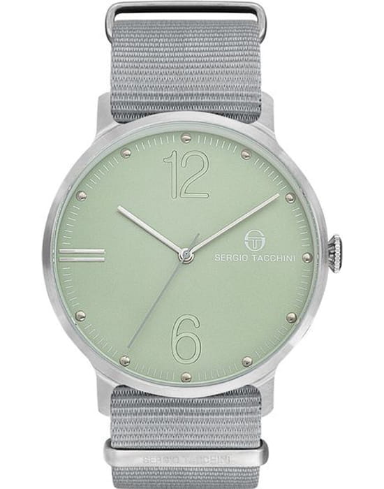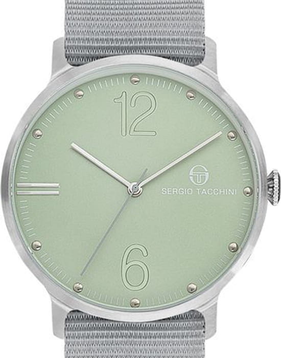 Sergio Tacchini — стильные мужские часы в минималистичном дизайне, подчеркивающем лёгкость и современность образа. Круглый корпус выполнен из нержавеющей стали, а циферблат оформлен крупными арабскими цифрами «6» и «12» и тонкими метками, что делает показания лёгкими для восприятия.
