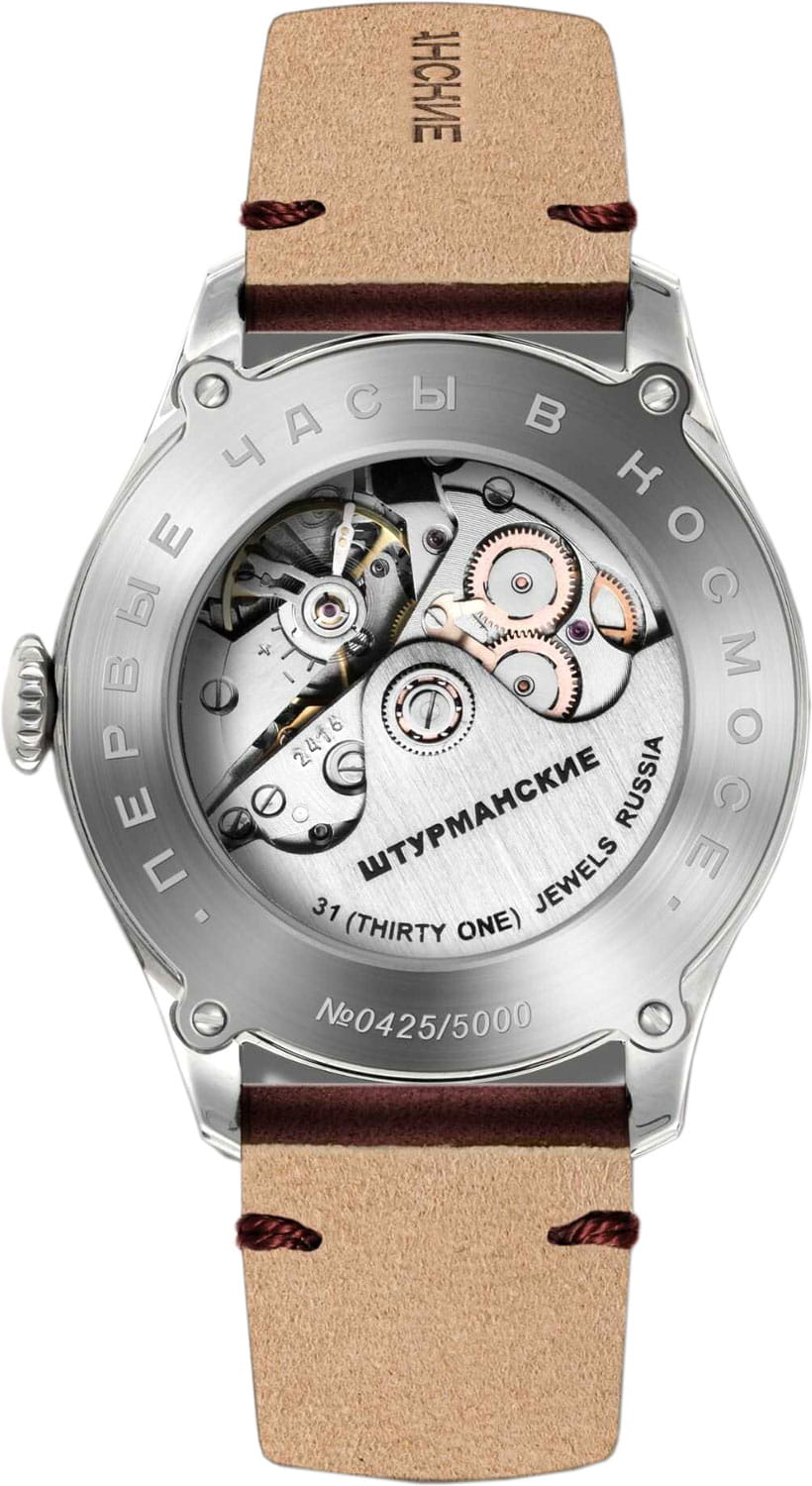 Лимитированные мужские российские механические часы Штурманские Гагарин Наследие 2416/3905146, механический механизм (автоматический калибр) с высокой точностью. Минеральное стеклоМинеральное стеклоМинеральное стекло представляет собой искусственно выращенный минерал кварца. Такое стекло отличается особой устойчивостью к повреждениям и царапинам. Уступает по некоторым качествам сапфировому стеклу. устойчивое к мелким механическим повреждениям.. Класс водозащиты: 50 метров, позволит защитить корпус от случайных брызг или капель дождя. Корпус часов изготовлен из стали с PVD-покрытиемPVDУльтратонкое покрытие наносится в технике вакуумного напыления, сочетает в себе нитрид титана особой прочности со слоем золота или оксида хрома. Несёт в себе декоративную или защитную функцию.. Кожаный ремешок на стандартной застёжке. Стрелки и метки с люминесцентным покрытиемЛюминесцентное покрытиеПозволяет считывать показания времени в темноте. Производители наносят на стрелки, часовые индексы, безель или поверхность циферблата светонакопительный состав, дающий холодное свечение.. Задняя крышка с барельефом Гагарина. Чёткая, читаемая минутная шкала уходит за приделы видимой области циферблата, подчёркивая изящность ободка корпуса. Оцифровка циферблата – отличительная особенность данной модели, её дизайн не изменился с самой первый, гагаринской серии. Заводная головка конической формы с удобной насечкой повторяет дизайн оригинальной модели.