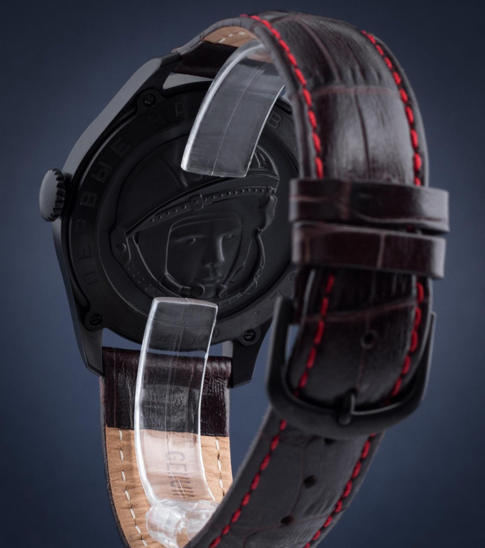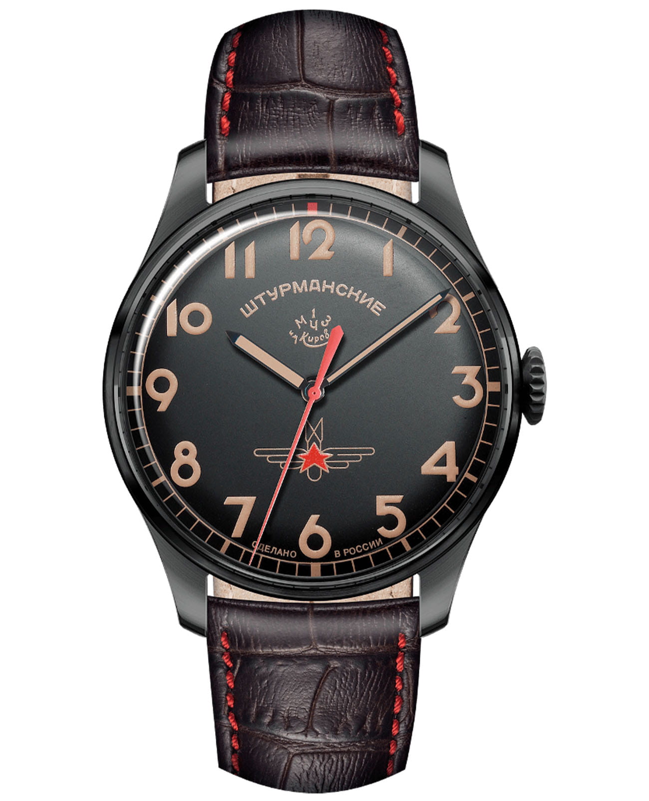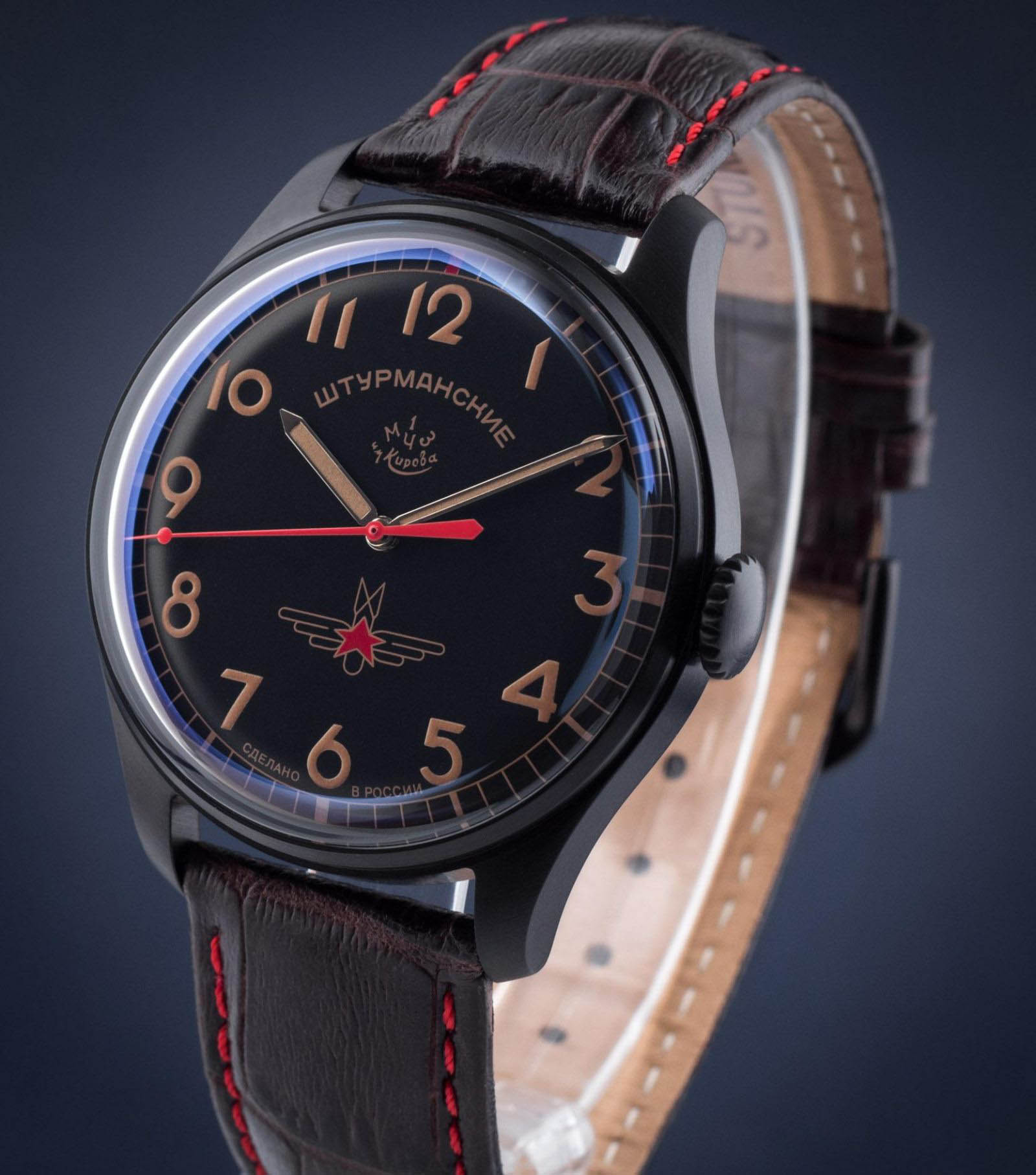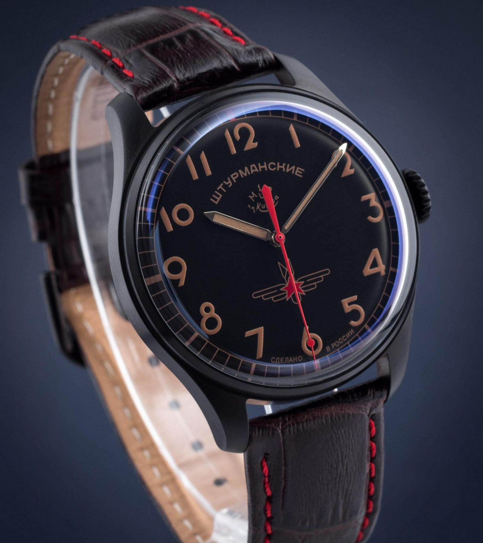 Лимитированные мужские российские механические часы с минеральным стекломМинеральное стеклоМинеральное стекло представляет собой искусственно выращенный минерал кварца. Такое стекло отличается особой устойчивостью к повреждениям и царапинам. Уступает по некоторым качествам сапфировому стеклу. Штурманские Гагарин Винтаж 2609/3714129, механический механизм (автоматический калибр) с высокой точностью. Лимитированная серия - 3000 экземпляров. Класс водозащиты: 30 метров, позволит защитить корпус от случайных брызг или капель дождя. Корпус часов изготовлен из титана с PVD-покрытиемPVDУльтратонкое покрытие наносится в технике вакуумного напыления, сочетает в себе нитрид титана особой прочности со слоем золота или оксида хрома. Несёт в себе декоративную или защитную функцию.. Кожаный ремешок на стандартной застёжке. Стрелки и метки с люминесцентным покрытиемЛюминесцентное покрытиеПозволяет считывать показания времени в темноте. Производители наносят на стрелки, часовые индексы, безель или поверхность циферблата светонакопительный состав, дающий холодное свечение.. Лаконичный циферблат не пугает обилием шкал и цифр, при этом отлично читается даже в темноте. Работу часов обеспечивает отлично зарекомендовавший себя механизм Полет 2609 с запасом хода на 38 часов. На задней стороне модели расположен барельеф с изображением Юрия Гагарина под прозрачной крышкой.