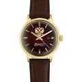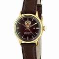 Российские механические наручные часы Слава 1879093/300-6Т15 станут стильным и надежным аксессуаром для вашего образа. Эти элегантные часы созданы с акцентом на высокое качество и изысканный дизайн. Оборудованные механизмом Miyota 6T15 с автоподзаводом, они обеспечивают точность и надежность, поддерживая запас хода до 40 часов. Часы заключены в прочный стальной корпус  с IP-покрытиемIP-покрытиеМетод ионного напыления. Демонстрирует повышенную устойчивость к истиранию, окислению и химическим веществам. Под воздействием высокого давления и температуры около 1500°C молекулы металла надёжно соединяются с частицами корпуса часов. диаметром 32 мм и минеральным стекломМинеральное стеклоМинеральное стекло представляет собой искусственно выращенный минерал кварца. Такое стекло отличается особой устойчивостью к повреждениям и царапинам. Уступает по некоторым качествам сапфировому стеклу., что обеспечивает надежную защиту и долговечность. Коричневый циферблат украшен изображением герба Российской Федерации и автографом В.В. Путина. Широкие заостренные стрелки в стиле Baton и штриховые метки придают циферблату выразительность и читаемость. Часы оснащены календарем с окошком даты на 3 часах, что делает их еще более функциональными. Рифленая заводная головка и завинчивающаяся задняя крышка добавляют изделию надежности и комфорта в использовании. Завершает образ текстурированный кожаный ремешок коричневого цвета с классической застежкой, который обеспечивает удобную посадку на запястье. Благодаря водозащите до 50WR, эти часы подойдут для повседневного использования, сохраняя свой безупречный вид и функциональность.