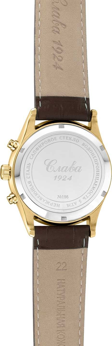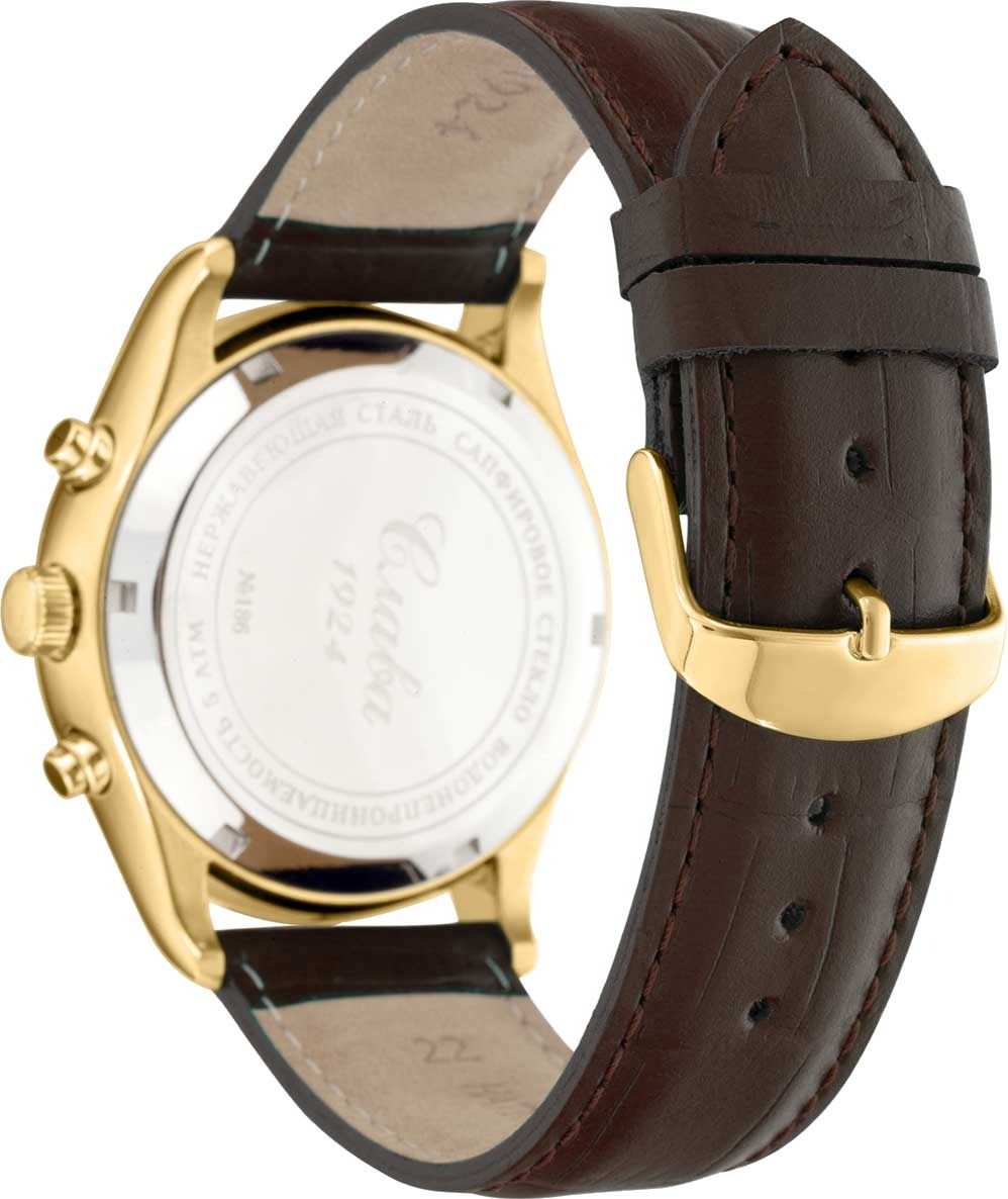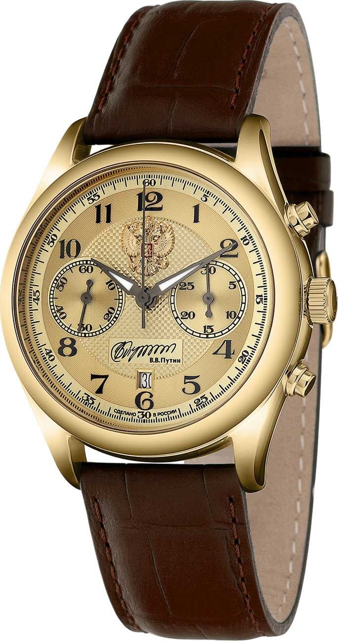Российские механические часы-хронографХронографФункция позволяет измерять отрезки времени с особой точностью: часы, минуты, секунды. Верным признаком хронографа является наличие на циферблате 3 дополнительных окошек-счётчиков. с секундомеромСекундомерСекундоме́р — прибор, способный измерять интервалы времени с точностью до долей секунды. Слава 1889141/300-4617, созданные для тех, кто ценит стиль и надежность. Эти часы сочетают в себе классический дизайн и современные технологии, предлагая исключительную функциональность и элегантность. Часы оснащены механизмом Peacock 4617 с автоподзаводом, а запас хода достигает 45 часов, что делает их идеальным выбором для повседневного использования. Корпус часов диаметром 42 мм выполнен из стали с изысканным золотистым IP-покрытиемIP-покрытиеМетод ионного напыления. Демонстрирует повышенную устойчивость к истиранию, окислению и химическим веществам. Под воздействием высокого давления и температуры около 1500°C молекулы металла надёжно соединяются с частицами корпуса часов.. Золотистый циферблат украшен изображением герба Российской Федерации и дополнен арабскими цифрами, что обеспечивает отличную читаемость. Стрелки с люминесцентным покрытиемЛюминесцентное покрытиеПозволяет считывать показания времени в темноте. Производители наносят на стрелки, часовые индексы, безель или поверхность циферблата светонакопительный состав, дающий холодное свечение. облегчают чтение времени даже в условиях слабого освещения. Окошко даты расположено в положении 6 часов, добавляя дополнительную практичность. Защиту обеспечивает сапфировое стеклоСапфировое стеклоПрочный и надёжный материал из кристалла сапфира синтетического происхождения, характеризующийся особой твёрдостью и устойчивостью к царапинам и повреждениям., устойчивое к царапинам, и водозащита до 50WR, что позволяет носить часы в различных условиях. Рифленая заводная головка и кожаный ремешок с классической застежкой завершают образ, придавая часам дополнительную элегантность и комфорт.