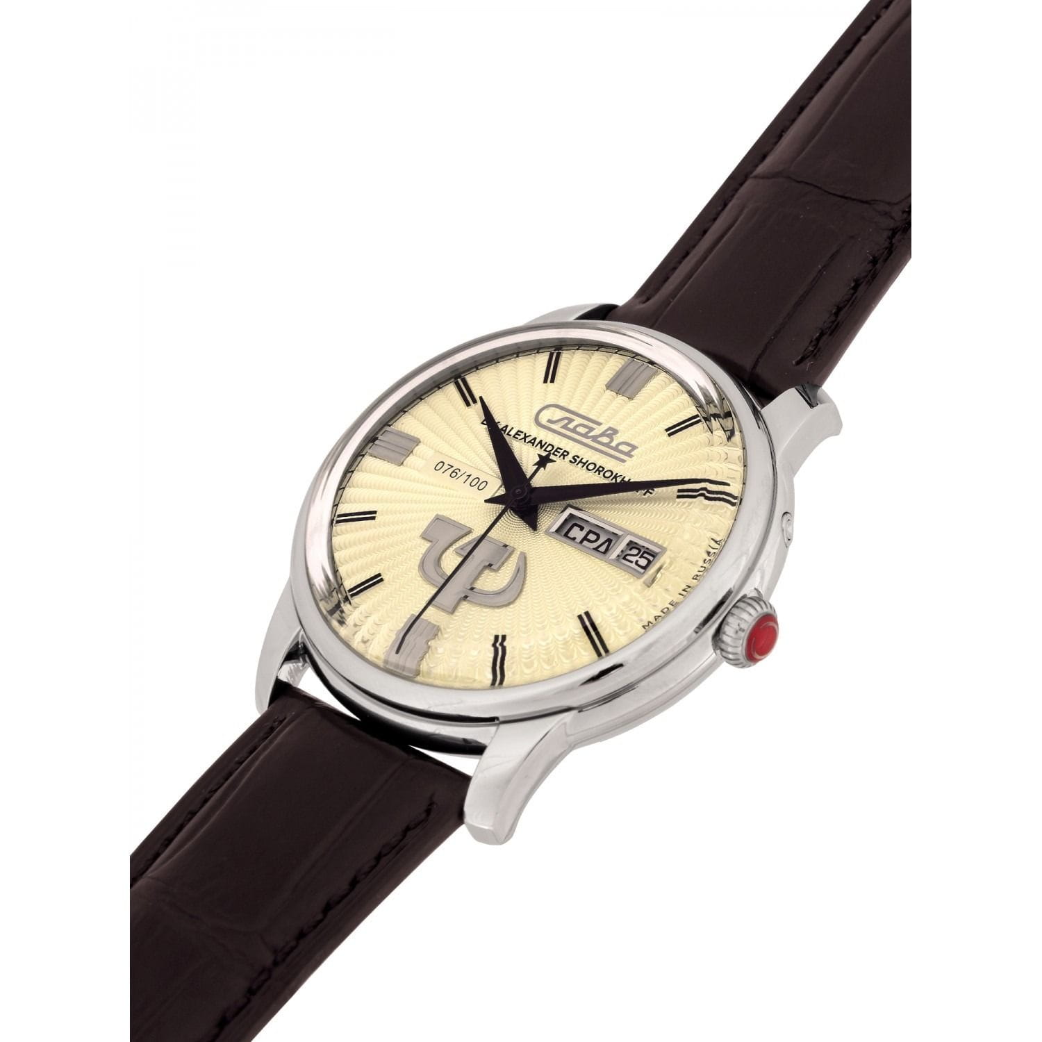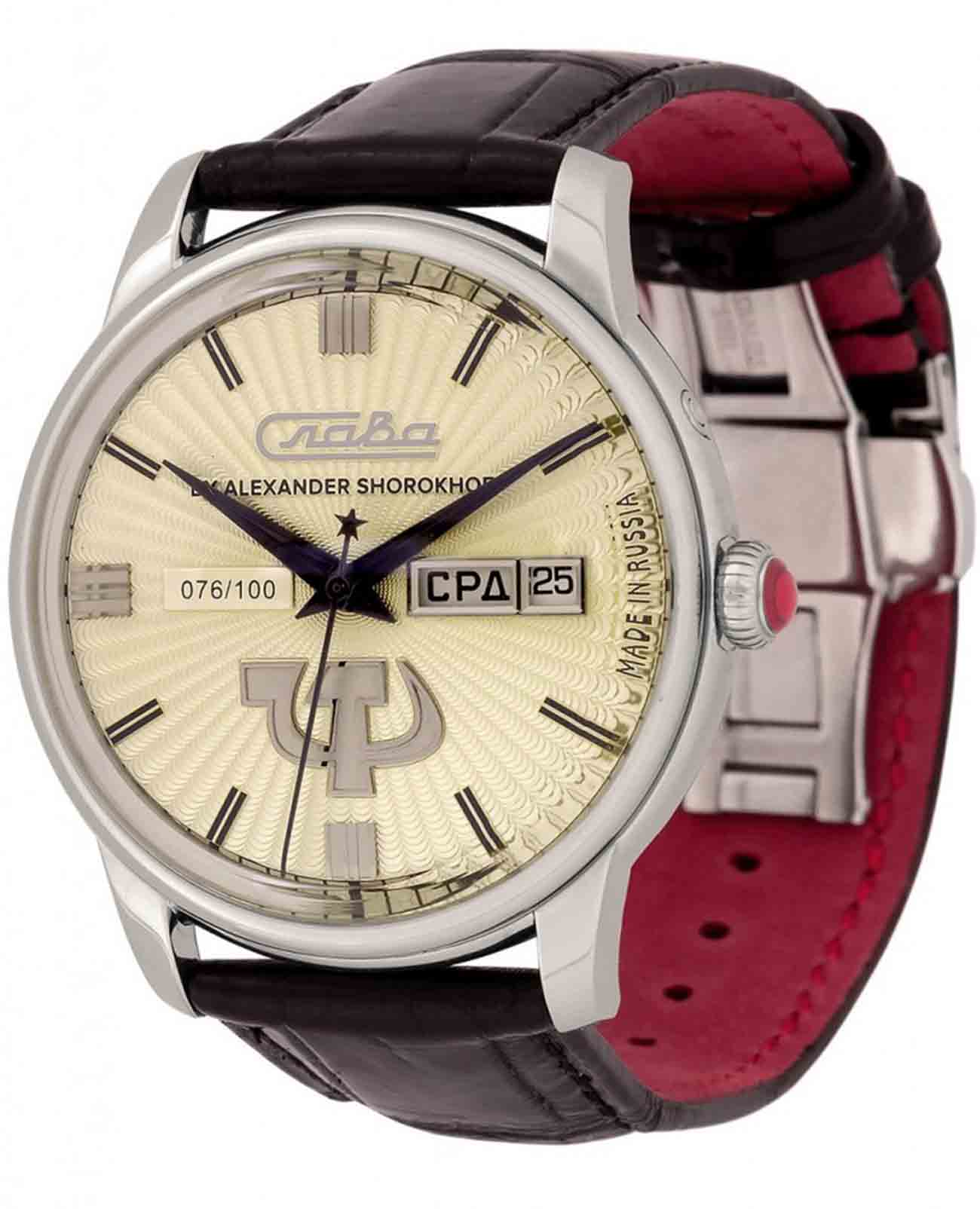 Российские механические часы с автоподзаводом Слава Революция 2600270/300-2427 созданы для тех, кто ценит стиль и надежность. Эта модель является плодом сотрудничества Часовой компании «Слава» и знаменитого мастера Александра Шорохова, который известен своим вкладом в возрождение российского часового мастерства и продвижение культуры в мире. Эти часы выполнены в соответствии с эскизами мастера, с использованием революционных символов — серпа и молота. Часы Слава «Революция» обладают механизмом с автоподзаводом «Слава 2427», украшенным ручной гравировкой, который можно наблюдать через прозрачную заднюю крышку. Этот механизм обеспечивает надежность и точность, а также добавляет элемент эксклюзивности. Корпус часов выполнен из стали и имеет серебристый оттенок, который гармонично сочетается с бежевым циферблатом. Диаметр корпуса составляет 44 мм, а толщина — 14,5 мм, что делает часы выразительными и комфортными для носки. Сапфировое стеклоСапфировое стеклоПрочный и надёжный материал из кристалла сапфира синтетического происхождения, характеризующийся особой твёрдостью и устойчивостью к царапинам и повреждениям. защищает циферблат от царапин и обеспечивает долгий срок службы. Часы оснащены функцией двойного календаря, который отображает дату, что добавляет практичности в повседневной носке. Натуральный кожаный ремешок с застежкой «бабочка»Застёжка "бабочка"Такой вид застёжки дополняется предохранителями, помогающими избежать случайного раскрытия браслета. Обладают изящным исполнением. завершают образ, обеспечивая удобство и стиль. С водонепроницаемостью до 100 метров эти часы подходят для активного образа жизни, позволяя не беспокоиться о случайных контактах с водой, таких как плавание или дождь. Слава «Революция» выпускаются ограниченной серией — в трех видах по 100 штук.