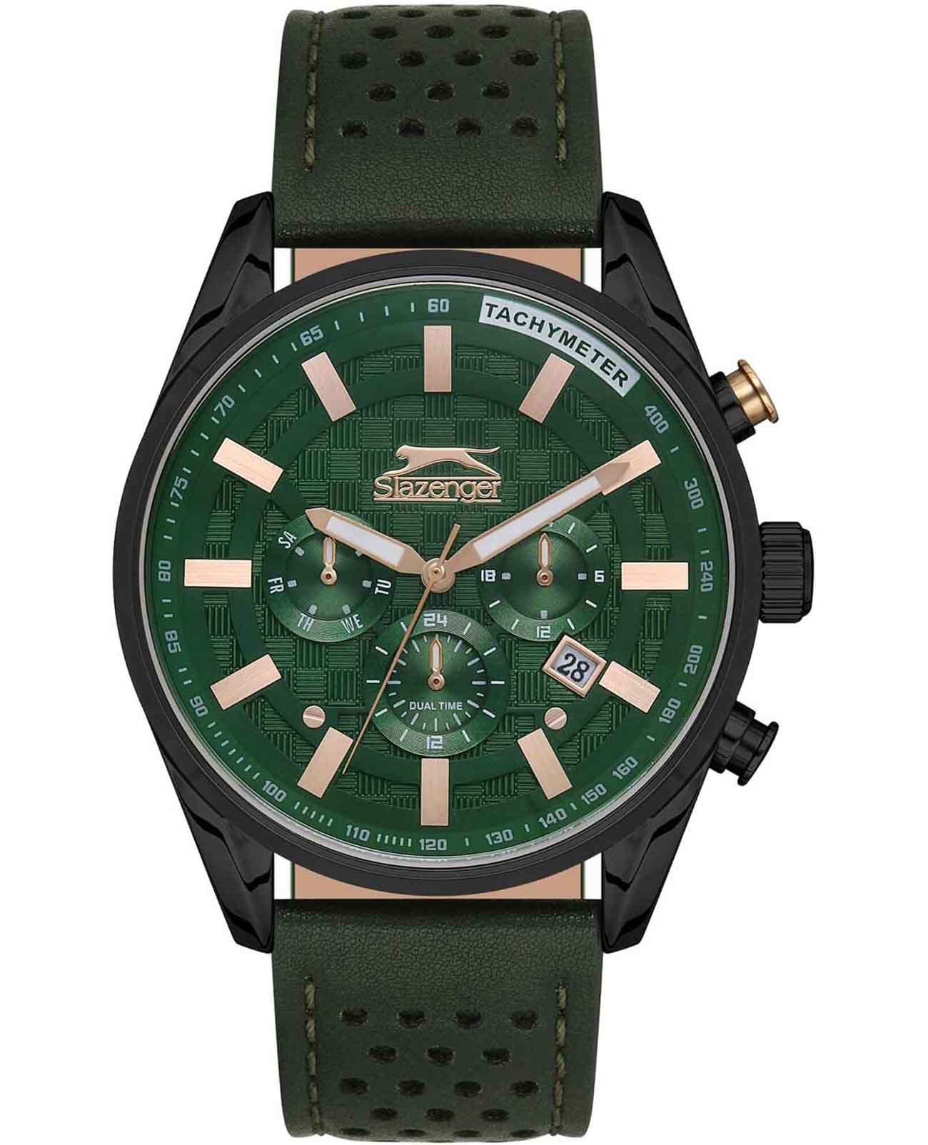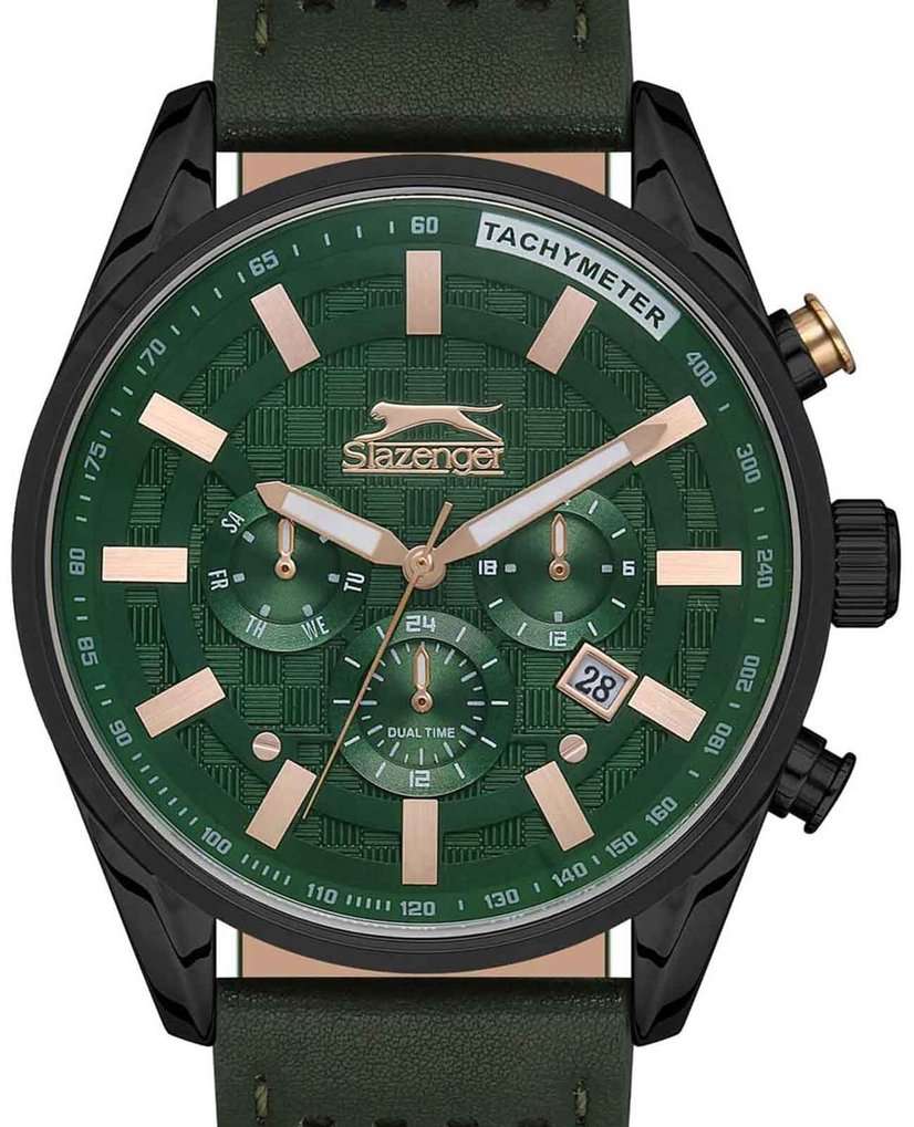 Мужские часы Slazenger SL.09.2096.2.04 — это воплощение элегантности и надежности, идеальные для современного мужчины. Зеленый циферблат, обрамленный черным корпусом и таким же безелемБезельВнешний ободок, закрепляющий стекло. В спортивных часах так называется поворотное кольцо с делениями на циферблате, выполняет роль таймера – замеряет отрезки времени на шкале. Неподвижный безель – элемент декора. Однонаправленно вращающийся безель на дайверских часах позволяет фиксировать моменты погружения и выныривания на поверхность. из суперметалла с IP-покрытиемIP-покрытиеМетод ионного напыления. Демонстрирует повышенную устойчивость к истиранию, окислению и химическим веществам. Под воздействием высокого давления и температуры около 1500°C молекулы металла надёжно соединяются с частицами корпуса часов., привлекает внимание своим современным дизайном. Кварцевый механизм гарантирует безупречную точность. Черный кожаный браслет с комфортной посадкой подчеркивает классический стиль и добавляет изысканности. Минеральное стеклоМинеральное стеклоМинеральное стекло представляет собой искусственно выращенный минерал кварца. Такое стекло отличается особой устойчивостью к повреждениям и царапинам. Уступает по некоторым качествам сапфировому стеклу. защищает часы от повреждений, а люминесцентное покрытиеЛюминесцентное покрытиеПозволяет считывать показания времени в темноте. Производители наносят на стрелки, часовые индексы, безель или поверхность циферблата светонакопительный состав, дающий холодное свечение. на стрелках и метках обеспечивает отличную видимость даже в условиях недостаточного освещения. Эти часы оснащены множеством полезных функций, включая 24-часовой указатель времени, второй часовой поясВторой часовой поясФункция, позволяющая отображать время двух часовых поясов одновременно., индикаторы даты и дня недели, а также тахиметрТахиметрРазмеченная шкала, располагается на ободке или безеле часов. Тахиметр позволяет рассчитать скорость на определённом участке пути, расстояние измеряется в километрах или милях. для измерения скорости. А водозащита до 5 ATM позволяет не беспокоиться о случайных попаданиях воды.