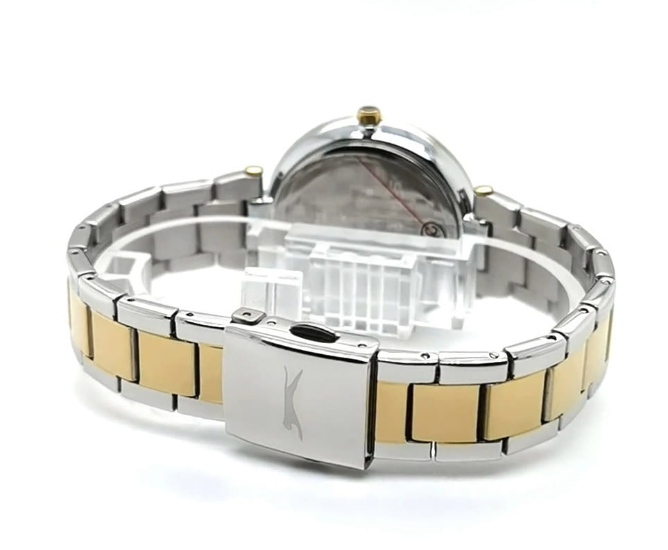 Slazenger SL.09.2122.3.06 — это элегантные женские наручные часы. Они имеют круглый циферблат с диаметром 34 мм, выполненный в золотистом цвете. Корпус часов, толщиной 9 мм, изготовлен из суперметалла с IP-покрытиемIP-покрытиеМетод ионного напыления. Демонстрирует повышенную устойчивость к истиранию, окислению и химическим веществам. Под воздействием высокого давления и температуры около 1500°C молекулы металла надёжно соединяются с частицами корпуса часов., что обеспечивает долговечность и устойчивость к коррозии. Браслет также выполнен из суперметалла с IP-покрытиемIP-покрытиеМетод ионного напыления. Демонстрирует повышенную устойчивость к истиранию, окислению и химическим веществам. Под воздействием высокого давления и температуры около 1500°C молекулы металла надёжно соединяются с частицами корпуса часов., придавая часам стильный и современный вид. Размер браслета (H1-H2): 16-14 мм. Часы оснащены кварцевым механизмом, который гарантирует точность хода. Циферблат защищен минеральным стекломМинеральное стеклоМинеральное стекло представляет собой искусственно выращенный минерал кварца. Такое стекло отличается особой устойчивостью к повреждениям и царапинам. Уступает по некоторым качествам сапфировому стеклу., устойчивым к царапинам. Модель водонепроницаема до 30 метров, что позволяет носить ее во время дождя или мытья рук. Браслет оснащен раскладной застёжкойРаскладная застёжкаТакой тип застёжки используется только на браслетах из металла. Она никогда не раскрывается полностью, происходит разделение на 2 и более частей. Раскладывающая застёжка снизит вероятность потери часов к минимуму. для удобства использования. Эти часы сочетают в себе функциональность и стильный дизайн, делая их отличным аксессуаром для повседневного использования и особых случаев.