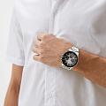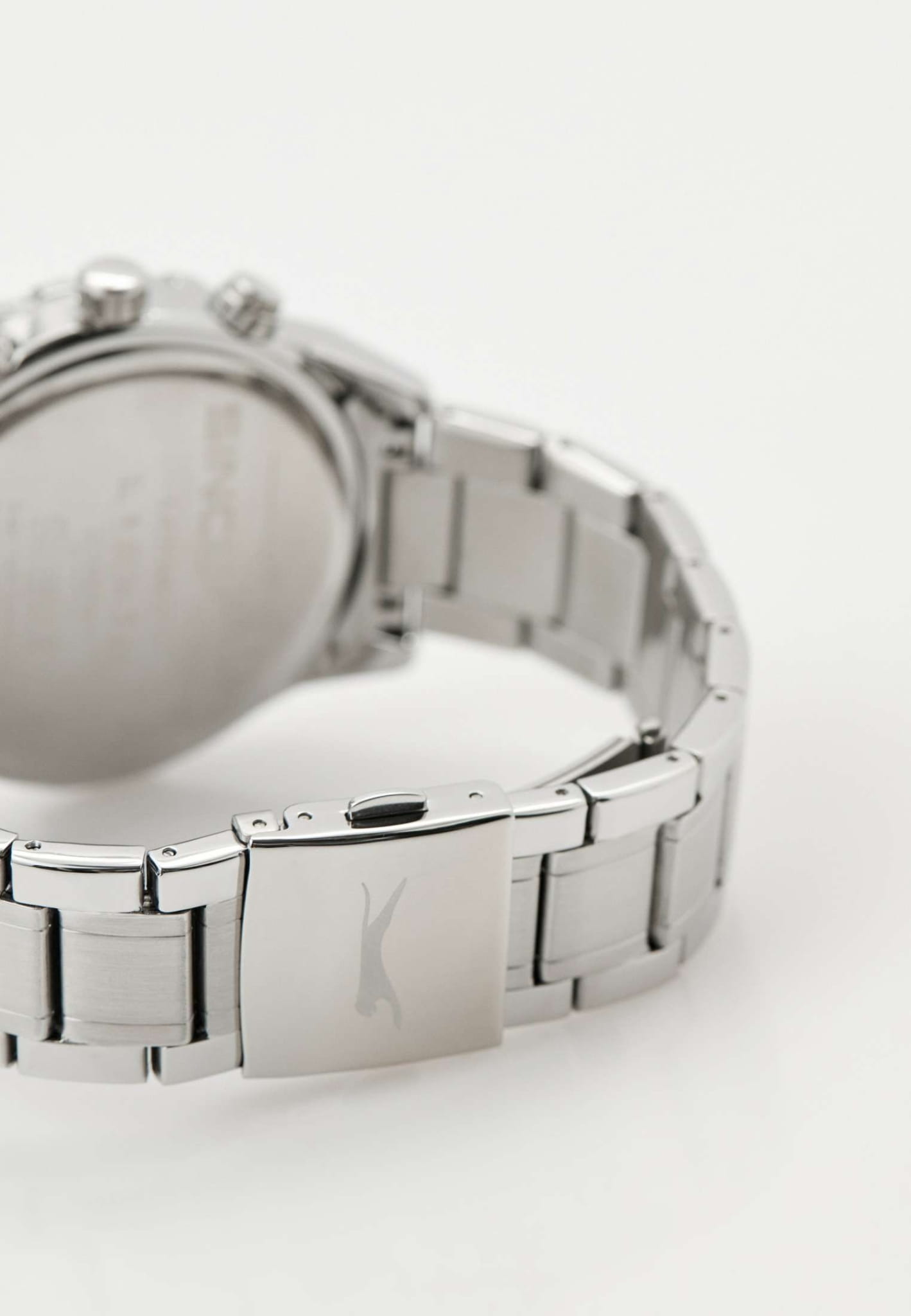 Часы Slazenger SL.09.2236.2.01 — это стильная и надежная модель, которая станет отличным выбором для активного современного мужчины. Крупный корпус диаметром 46 мм выполнен из прочного металла, а серебристый металлический браслет оснащён удобной раскладной застёжкойРаскладная застёжкаТакой тип застёжки используется только на браслетах из металла. Она никогда не раскрывается полностью, происходит разделение на 2 и более частей. Раскладывающая застёжка снизит вероятность потери часов к минимуму., что обеспечивает комфорт при повседневном ношении. На безельБезельВнешний ободок, закрепляющий стекло. В спортивных часах так называется поворотное кольцо с делениями на циферблате, выполняет роль таймера – замеряет отрезки времени на шкале. Неподвижный безель – элемент декора. Однонаправленно вращающийся безель на дайверских часах позволяет фиксировать моменты погружения и выныривания на поверхность. нанесено черное IP-покрытиеIP-покрытиеМетод ионного напыления. Демонстрирует повышенную устойчивость к истиранию, окислению и химическим веществам. Под воздействием высокого давления и температуры около 1500°C молекулы металла надёжно соединяются с частицами корпуса часов.. Минеральное стеклоМинеральное стеклоМинеральное стекло представляет собой искусственно выращенный минерал кварца. Такое стекло отличается особой устойчивостью к повреждениям и царапинам. Уступает по некоторым качествам сапфировому стеклу. защищает текстурированный черно-белый циферблат с градиентом от случайных царапин, а водозащита уровня WR 50 позволяет не переживать о попадании влаги при контакте с водой. На циферблате расположены дополнительные малые циферблаты с отображением даты, дня недели и времени в 24-часовом формате, что делает использование часов максимально функциональным. Для удобства использования в темное время суток предусмотрено люминесцентное покрытиеЛюминесцентное покрытиеПозволяет считывать показания времени в темноте. Производители наносят на стрелки, часовые индексы, безель или поверхность циферблата светонакопительный состав, дающий холодное свечение. стрелок. Толщина корпуса составляет 13 мм, вес часов — 152 грамма.