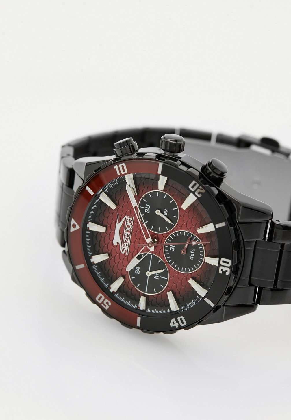 Часы Slazenger SL.09.2236.2.04 — это стильная и надежная модель, которая станет отличным выбором для активного современного мужчины. Крупный корпус диаметром 46 мм и браслет с раскладной застёжкойРаскладная застёжкаТакой тип застёжки используется только на браслетах из металла. Она никогда не раскрывается полностью, происходит разделение на 2 и более частей. Раскладывающая застёжка снизит вероятность потери часов к минимуму. с черным IP-покрытиемIP-покрытиеМетод ионного напыления. Демонстрирует повышенную устойчивость к истиранию, окислению и химическим веществам. Под воздействием высокого давления и температуры около 1500°C молекулы металла надёжно соединяются с частицами корпуса часов. выполнены из прочного металла, что обеспечивает комфорт и долговечность. На безельБезельВнешний ободок, закрепляющий стекло. В спортивных часах так называется поворотное кольцо с делениями на циферблате, выполняет роль таймера – замеряет отрезки времени на шкале. Неподвижный безель – элемент декора. Однонаправленно вращающийся безель на дайверских часах позволяет фиксировать моменты погружения и выныривания на поверхность. нанесено черное и красное IP-покрытиеIP-покрытиеМетод ионного напыления. Демонстрирует повышенную устойчивость к истиранию, окислению и химическим веществам. Под воздействием высокого давления и температуры около 1500°C молекулы металла надёжно соединяются с частицами корпуса часов.. Минеральное стеклоМинеральное стеклоМинеральное стекло представляет собой искусственно выращенный минерал кварца. Такое стекло отличается особой устойчивостью к повреждениям и царапинам. Уступает по некоторым качествам сапфировому стеклу. защищает текстурированный черно-красный циферблат с градиентом от случайных царапин, а водозащита уровня WR 50 позволяет не переживать о попадании влаги при контакте с водой. На циферблате расположены дополнительные малые циферблаты с отображением даты, дня недели и времени в 24-часовом формате, что делает использование часов максимально функциональным. Для удобства использования в темное время суток предусмотрено люминесцентное покрытиеЛюминесцентное покрытиеПозволяет считывать показания времени в темноте. Производители наносят на стрелки, часовые индексы, безель или поверхность циферблата светонакопительный состав, дающий холодное свечение. стрелок. Толщина корпуса составляет 13 мм, вес часов — 152 грамма.