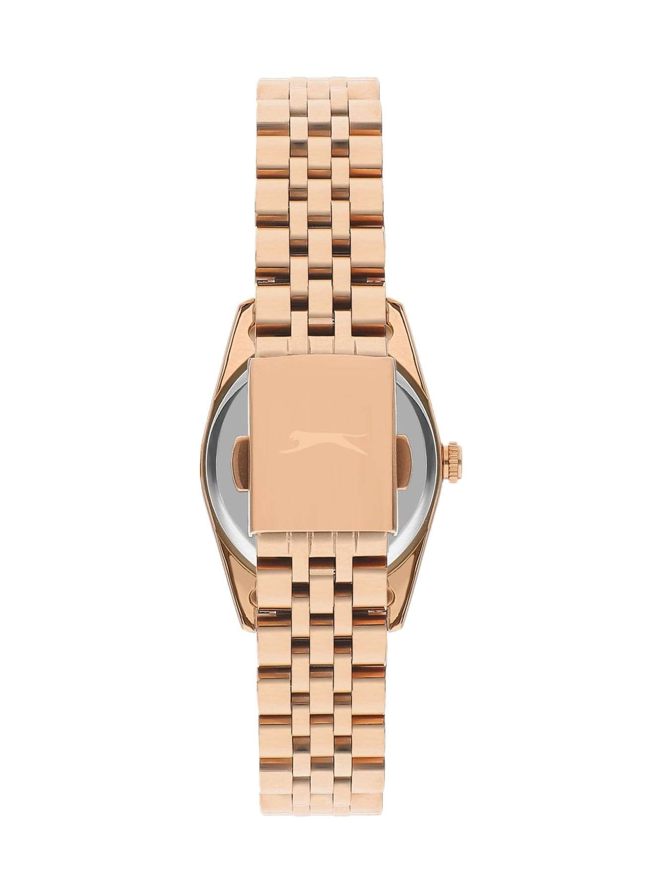 Эти женские часы Slazenger SL.09.2240.3.05 сочетают стильный дизайн и практичность. Корпус, браслет и рифленый безельБезельВнешний ободок, закрепляющий стекло. В спортивных часах так называется поворотное кольцо с делениями на циферблате, выполняет роль таймера – замеряет отрезки времени на шкале. Неподвижный безель – элемент декора. Однонаправленно вращающийся безель на дайверских часах позволяет фиксировать моменты погружения и выныривания на поверхность. выполнены из прочного металла золотистого цвета с IP-покрытиемIP-покрытиеМетод ионного напыления. Демонстрирует повышенную устойчивость к истиранию, окислению и химическим веществам. Под воздействием высокого давления и температуры около 1500°C молекулы металла надёжно соединяются с частицами корпуса часов., что придает аксессуару элегантный и современный вид. Черный перламутровый циферблат украшен кристаллами, что добавляет часам изысканности и утонченности, также он дополнен функцией календаря, отображающей число месяца. Модель оснащена кварцевым механизмом, который обеспечивает точность хода, а также функцией отображения даты с увеличительным стеклом для удобства просмотра. Минеральное стеклоМинеральное стеклоМинеральное стекло представляет собой искусственно выращенный минерал кварца. Такое стекло отличается особой устойчивостью к повреждениям и царапинам. Уступает по некоторым качествам сапфировому стеклу. защищает циферблат от царапин, водозащита уровня WR 30 позволяет выдерживать случайные брызги воды. Удобная раскладная застёжкаРаскладная застёжкаТакой тип застёжки используется только на браслетах из металла. Она никогда не раскрывается полностью, происходит разделение на 2 и более частей. Раскладывающая застёжка снизит вероятность потери часов к минимуму. обеспечивает надежную фиксацию на запястье. Диаметр корпуса составляет 32 мм, ширина браслета — 16 мм, толщина корпуса — 9 мм, вес часов — 80 граммов. В комплект входит фирменная упаковка, инструкция на русском языке и гарантийный талон. Гарантия на изделие составляет 1 год.
