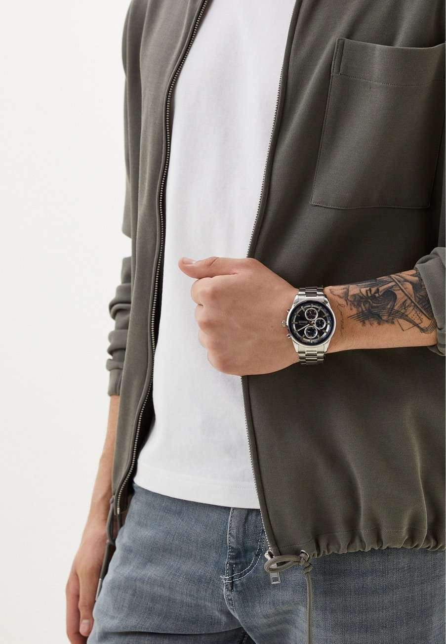 Часы Slazenger SL.09.2242.2.03 – это стильная и надежная модель, созданная для современных мужчин, ценящих качество и функциональность. Корпус и браслет выполнены из прочного металла серебряного цвета, что придает аксессуару элегантный внешний вид и обеспечивает долговечность. Часы фиксируются на руке с помощью браслета с удобной раскладной застёжкойРаскладная застёжкаТакой тип застёжки используется только на браслетах из металла. Она никогда не раскрывается полностью, происходит разделение на 2 и более частей. Раскладывающая застёжка снизит вероятность потери часов к минимуму.. Кварцевый механизм гарантирует точность хода, а минеральное стеклоМинеральное стеклоМинеральное стекло представляет собой искусственно выращенный минерал кварца. Такое стекло отличается особой устойчивостью к повреждениям и царапинам. Уступает по некоторым качествам сапфировому стеклу. защищает синий циферблат от царапин и повреждений. Диаметр корпуса составляет 46 мм, толщина – 13 мм, ширина ремешка – 24 мм, а вес часов – 146 грамм, что делает их удобными для повседневного ношения. Водозащита уровня WR 50 позволяет не снимать часы во время мытья рук и при незначительном контакте с водой. Для удобства использования в темное время суток предусмотрено люминесцентное покрытиеЛюминесцентное покрытиеПозволяет считывать показания времени в темноте. Производители наносят на стрелки, часовые индексы, безель или поверхность циферблата светонакопительный состав, дающий холодное свечение. стрелок. Модель оснащена дополнительными циферблатами, отображающими дату, день недели и текущее время в 24-часовом формате.