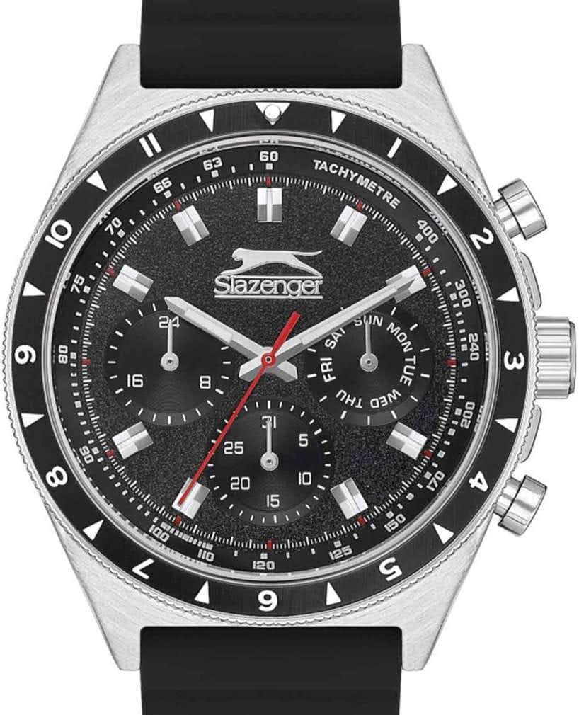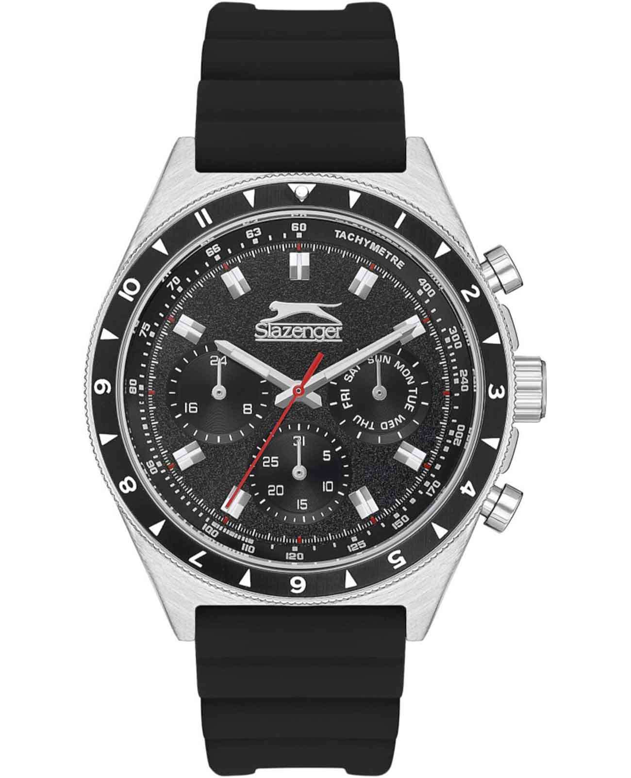 Часы Slazenger SL.09.2247.2.01 — это современная модель с выразительным спортивным характером, идеально подходящая для активного образа жизни. Корпус выполнен из прочного металла, черный циферблат защищён минеральным стекломМинеральное стеклоМинеральное стекло представляет собой искусственно выращенный минерал кварца. Такое стекло отличается особой устойчивостью к повреждениям и царапинам. Уступает по некоторым качествам сапфировому стеклу., устойчивым к царапинам. Часы также оснащены шкалой тахиметраТахиметрРазмеченная шкала, располагается на ободке или безеле часов. Тахиметр позволяет рассчитать скорость на определённом участке пути, расстояние измеряется в километрах или милях., что добавляет им функциональности и может быть полезно для измерения скорости.  На безельБезельВнешний ободок, закрепляющий стекло. В спортивных часах так называется поворотное кольцо с делениями на циферблате, выполняет роль таймера – замеряет отрезки времени на шкале. Неподвижный безель – элемент декора. Однонаправленно вращающийся безель на дайверских часах позволяет фиксировать моменты погружения и выныривания на поверхность. нанесено черное IP-покрытиеIP-покрытиеМетод ионного напыления. Демонстрирует повышенную устойчивость к истиранию, окислению и химическим веществам. Под воздействием высокого давления и температуры около 1500°C молекулы металла надёжно соединяются с частицами корпуса часов..  Диаметр корпуса составляет 46 мм, толщина — 11 мм, а ширина ремешка — 22 мм. Лёгкий и комфортный чёрный резиновый ремешок оснащён классической застёжкой, благодаря чему часы удобно сидят на руке и не вызывают дискомфорта даже при длительном ношении. Вес модели составляет всего 79 грамм. Надёжный кварцевый механизм обеспечивает точность времени, а уровень водозащиты WR 50 позволяет использовать часы в повседневных условиях, не опасаясь случайных брызг или дождя. Для удобства использования в темное время суток предусмотрено люминесцентное покрытиеЛюминесцентное покрытиеПозволяет считывать показания времени в темноте. Производители наносят на стрелки, часовые индексы, безель или поверхность циферблата светонакопительный состав, дающий холодное свечение. стрелок и меток. Дополнительные малые циферблаты показывают дату, день недели и текущее время в 24-часовом формате, что делает использование часов ещё более удобным и функциональным.