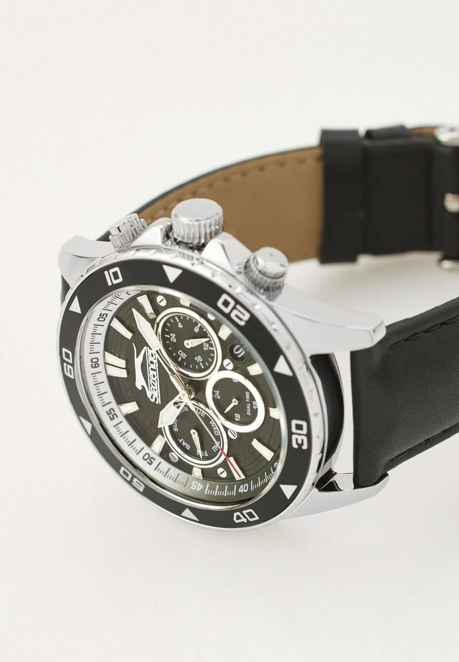 Часы Slazenger SL.09.2251.2.01 — это стильная и практичная модель, выполненная в элегантном серебристом цвете. Корпус изготовлен из металла, что обеспечивает прочность и долговечность. На безельБезельВнешний ободок, закрепляющий стекло. В спортивных часах так называется поворотное кольцо с делениями на циферблате, выполняет роль таймера – замеряет отрезки времени на шкале. Неподвижный безель – элемент декора. Однонаправленно вращающийся безель на дайверских часах позволяет фиксировать моменты погружения и выныривания на поверхность. нанесено черное IP-покрытиеIP-покрытиеМетод ионного напыления. Демонстрирует повышенную устойчивость к истиранию, окислению и химическим веществам. Под воздействием высокого давления и температуры около 1500°C молекулы металла надёжно соединяются с частицами корпуса часов.. Минеральное стеклоМинеральное стеклоМинеральное стекло представляет собой искусственно выращенный минерал кварца. Такое стекло отличается особой устойчивостью к повреждениям и царапинам. Уступает по некоторым качествам сапфировому стеклу. надежно защищает черный циферблат от царапин и повреждений. Классический кожаный ремешок черного цвета шириной 22 мм удобно фиксируется на запястье с помощью классической застежки. Диаметр корпуса составляет 44 мм, а толщина — 12 мм, благодаря чему часы смотрятся солидно и современно. Модель оснащена кварцевым механизмом, отличающимся точностью и надежностью. На циферблате представлены дополнительные малые циферблаты для отображения второго часового поясаВторой часовой поясФункция, позволяющая отображать время двух часовых поясов одновременно., дня недели и времени в 24-часовом формате, а также имеется отдельное окошко даты. Для удобства использования в темное время суток предусмотрено люминесцентное покрытиеЛюминесцентное покрытиеПозволяет считывать показания времени в темноте. Производители наносят на стрелки, часовые индексы, безель или поверхность циферблата светонакопительный состав, дающий холодное свечение. стрелок и меток. Заводная головка оснащена защитой. Водозащита уровня WR 50 позволяет не снимать часы при мытье рук или попадании под дождь. Вес модели составляет 70 грамм.