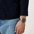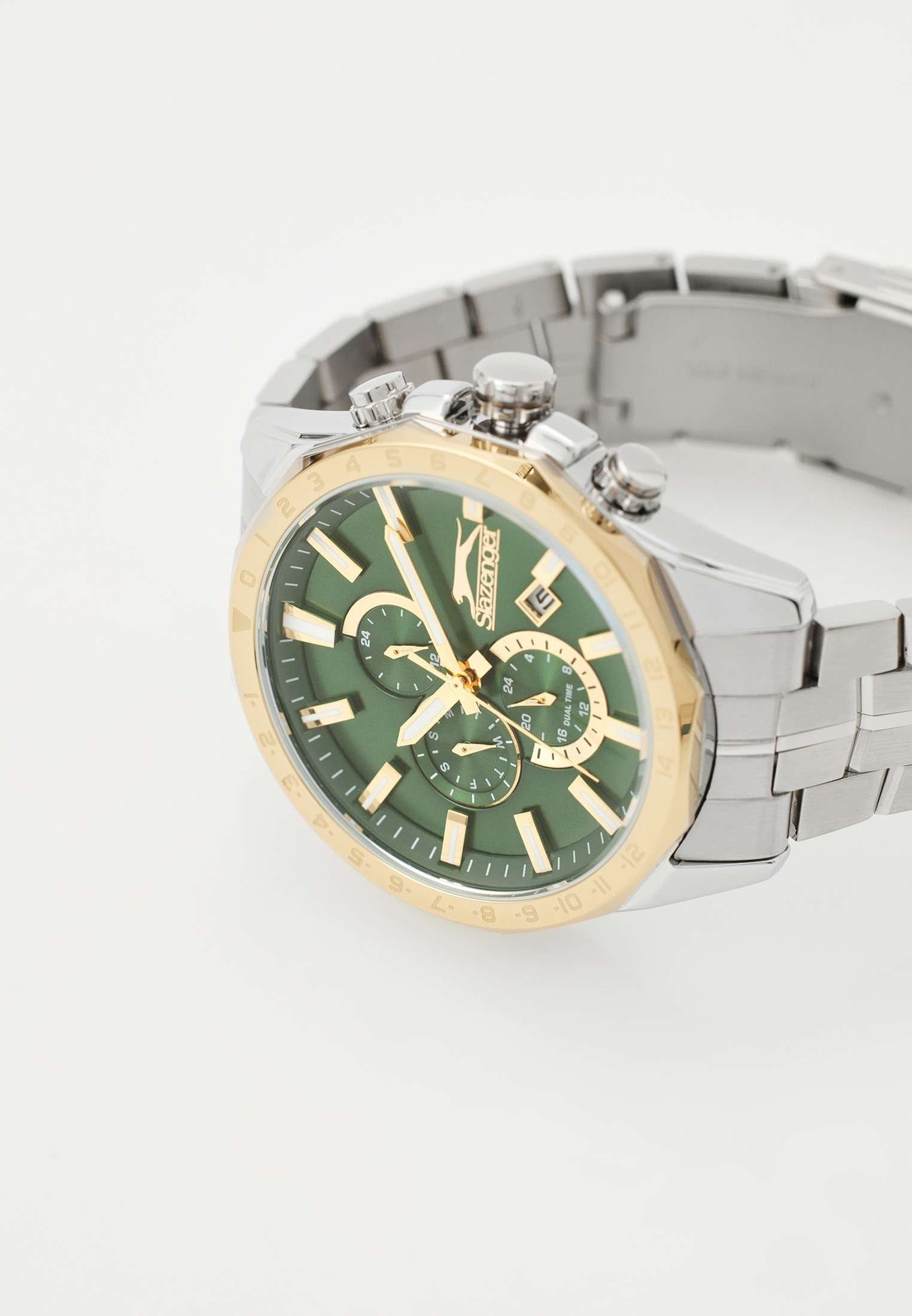 Часы Slazenger SL.09.2259.2.04 — это стильный и многофункциональный аксессуар, который станет достойным дополнением к вашему образу. Корпус и браслет модели выполнены из современного суперметалла — прочного сплава на основе меди с пониженным содержанием цинка и никеля, а также инновационным покрытием, что обеспечивает долговечность и привлекательный внешний вид. На безельБезельВнешний ободок, закрепляющий стекло. В спортивных часах так называется поворотное кольцо с делениями на циферблате, выполняет роль таймера – замеряет отрезки времени на шкале. Неподвижный безель – элемент декора. Однонаправленно вращающийся безель на дайверских часах позволяет фиксировать моменты погружения и выныривания на поверхность. нанесено золотистое IP-покрытиеIP-покрытиеМетод ионного напыления. Демонстрирует повышенную устойчивость к истиранию, окислению и химическим веществам. Под воздействием высокого давления и температуры около 1500°C молекулы металла надёжно соединяются с частицами корпуса часов., что придает аксессуару утончённый и универсальный внешний вид. Под минеральным стекломМинеральное стеклоМинеральное стекло представляет собой искусственно выращенный минерал кварца. Такое стекло отличается особой устойчивостью к повреждениям и царапинам. Уступает по некоторым качествам сапфировому стеклу. находится зеленый циферблат с дополнительными функциями: вынесенный 24-часовой индикатор, указатель дня недели, окно даты в положении между 4 и 5 часами, а также функция GMTGMTОтображение времени второго часового пояса.Такая функция особенно актуальна для путешественников и бизнесменов,которые общаются с людьми из разных стран,теперь вы всегда будете знать,какой час у вашего партнёра или близкого человека. для отслеживания второго часового поясаВторой часовой поясФункция, позволяющая отображать время двух часовых поясов одновременно. — всё это делает модель особенно удобной при активном образе жизни и путешествиях. Кварцевый механизм гарантирует высокую точность хода. Диаметр корпуса составляет 46 мм, толщина — 12 мм, что подчёркивает современный характер часов. Стрелки с люминесцентным покрытиемЛюминесцентное покрытиеПозволяет считывать показания времени в темноте. Производители наносят на стрелки, часовые индексы, безель или поверхность циферблата светонакопительный состав, дающий холодное свечение. удобно подсвечиваются в темноте после зарядки на свету. Стальной браслет с раскладной застёжкойРаскладная застёжкаТакой тип застёжки используется только на браслетах из металла. Она никогда не раскрывается полностью, происходит разделение на 2 и более частей. Раскладывающая застёжка снизит вероятность потери часов к минимуму. обеспечивает комфортную посадку. Водозащита до 5 атмосфер позволяет не опасаться случайных брызг или дождя. Часы идеально подходят для ежедневного ношения и особых случаев, а также станут отличным подарком.