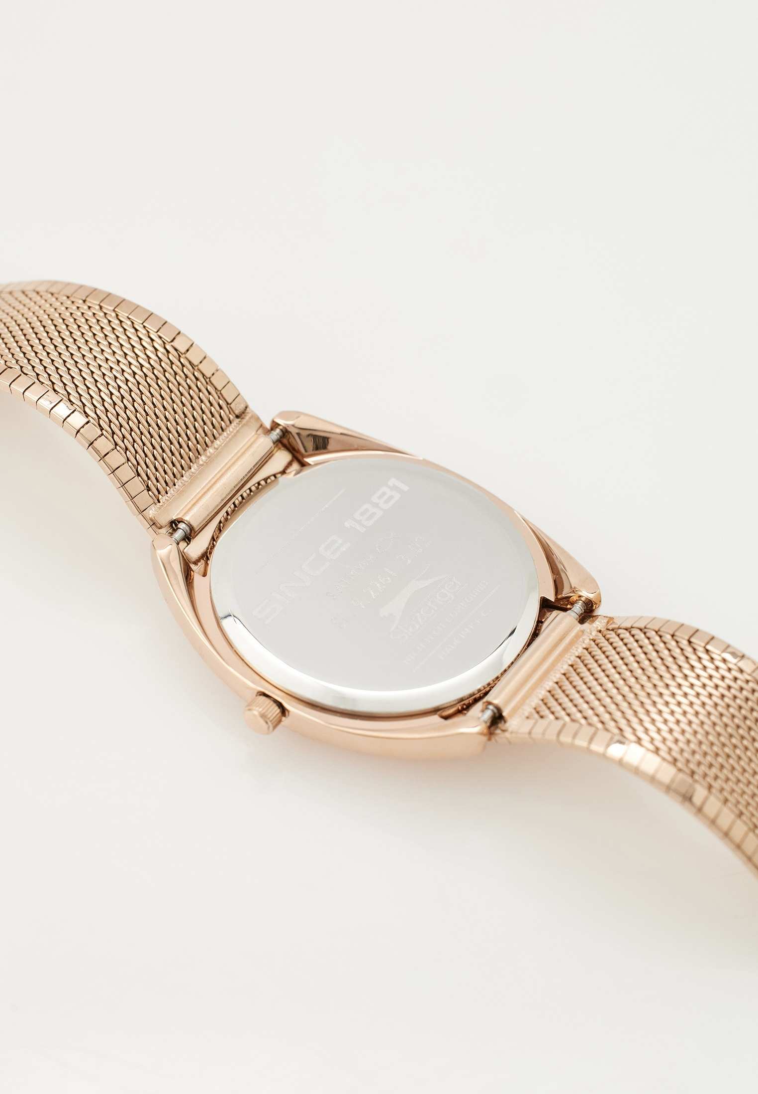 Часы Slazenger SL.09.2261.3.02 — это утонченное сочетание современного дизайна и классической элегантности. Изделие оснащено надежным кварцевым механизмом, который обеспечивает точность хода и простоту эксплуатации. Корпус из суперметалла с розово-золотистым IP-покрытиемIP-покрытиеМетод ионного напыления. Демонстрирует повышенную устойчивость к истиранию, окислению и химическим веществам. Под воздействием высокого давления и температуры около 1500°C молекулы металла надёжно соединяются с частицами корпуса часов. гармонично сочетается с металлическим браслетом аналогичного оттенка и покрытия, подчеркивая изысканность аксессуара и его актуальность в модных тенденциях. Золотистый розовый циферблат украшен изысканным гильоше Clous de Paris и дополнен лаконичными метками в виде штрихов, а также фирменным логотипом бренда. Минеральное стеклоМинеральное стеклоМинеральное стекло представляет собой искусственно выращенный минерал кварца. Такое стекло отличается особой устойчивостью к повреждениям и царапинам. Уступает по некоторым качествам сапфировому стеклу. надежно защищает циферблат от случайных царапин. Диаметр корпуса составляет 34 мм, толщина — 8 мм, ширина браслета — 18 мм, а вес часов — всего 54 г, благодаря чему аксессуар удобно сидит на запястье. Стальной браслет c раскладным замкомРаскладной замокДанный вариант застежки используется только на часах с металлическим браслетом. Отличительная особенность такого крепления в том, что длина браслета становится универсальной и вы можете самостоятельно отрегулировать нужный вам размер – застежка просто двигается по браслету часов. удобно фиксируется на запястье и подчёркивает современный характер часов. Водозащита 30WR позволяет не беспокоиться о случайных брызгах. Модель отличается отсутствием секундной стрелки и оснащена рифленой заводной головкой для легкой корректировки времени. Эти часы станут стильным завершением любого образа, подчеркивая индивидуальность и чувство вкуса обладателя.